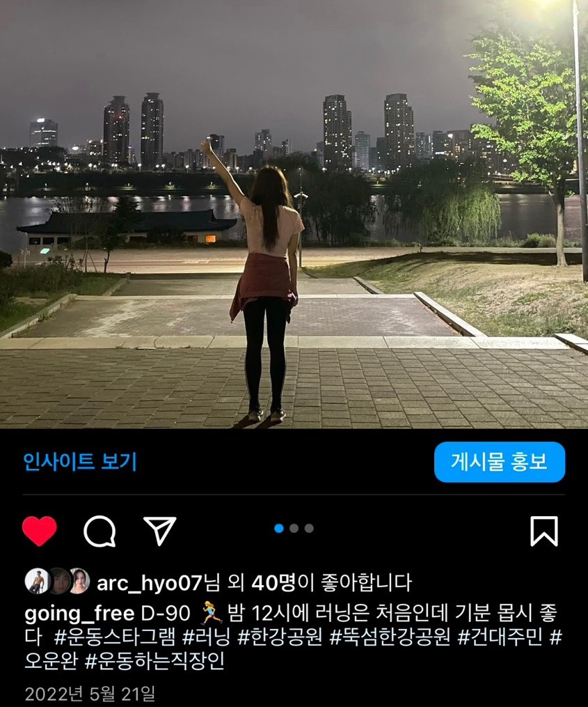 지금 생각하면 정말 허접한 게시물이지만, 이 게시물을 올리기 위해서 (일부러) 야밤에 한강을 3km나 뛰었었다. (평범한 운동 게시물을 올렸다가 하트가 하나도 눌리지 않았을까 내심 두려웠다. ;;)