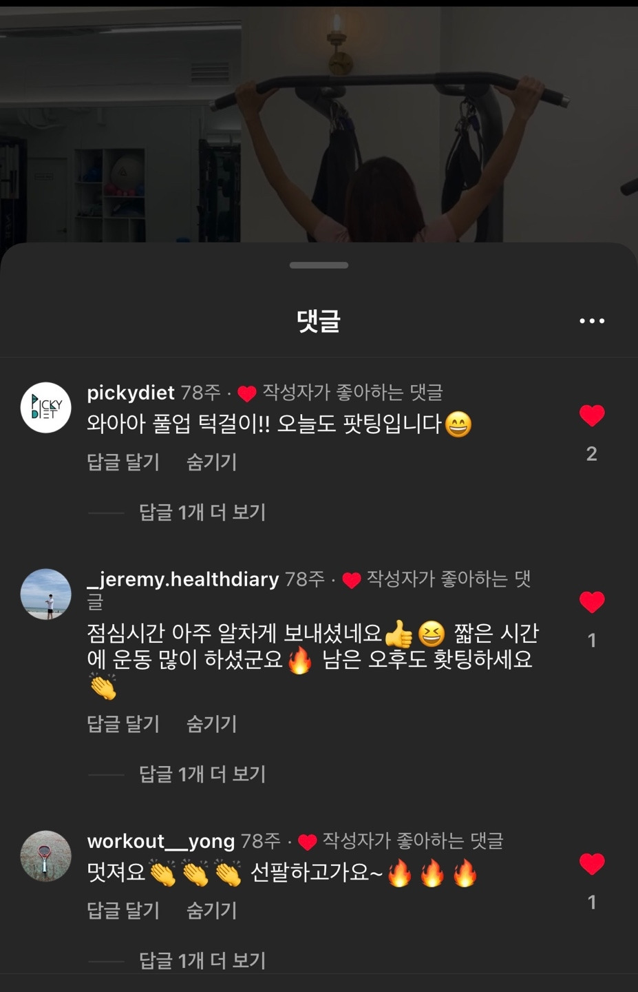 하루는 너무 우울해서 점심시간에 운동 가서 풀업 한 영상을 올렸다. 우울하지 않기 위해 간 운동이었는데, 알차게 잘 보냈다는 댓글에 나도 모르게 울컥했던 적도 있었다. 너무 감사했다. sns에서 만난 인연이 실제 인연보다 소중하게 느껴졌던 순간이었다.