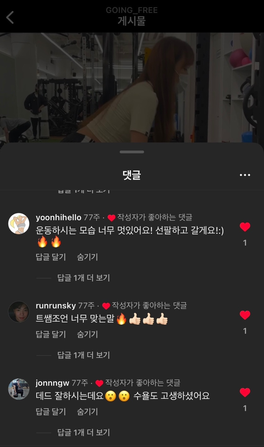 태그를 사용하자 인친분들과의 맞팔이 이뤄지기 시작했고, 내 게시물에 댓글을 달아주시면서 본격적인 '운동 소통'이 시작되었다.