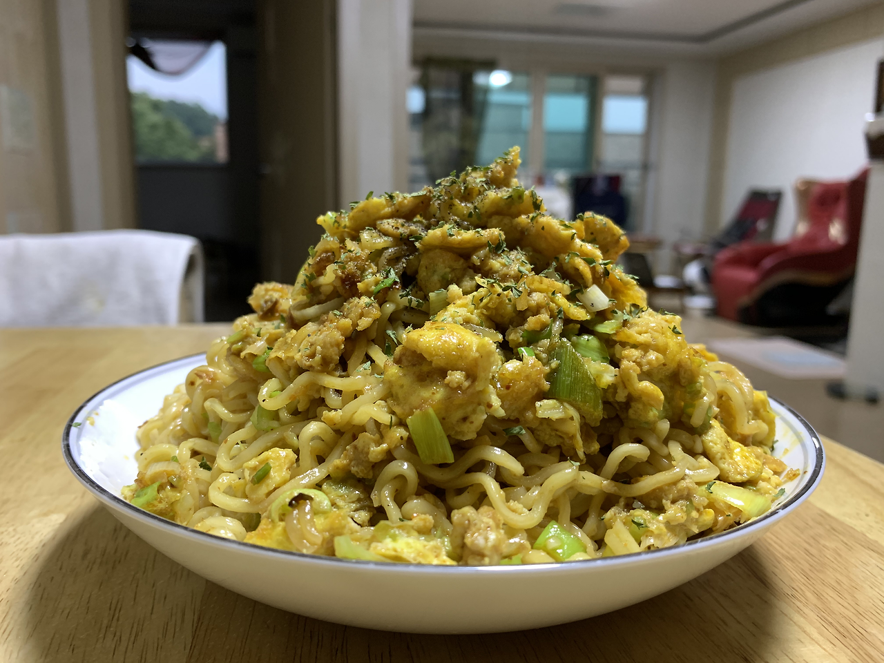 향을 더할 파를 다시 썰어 면과 함께 볶는다.