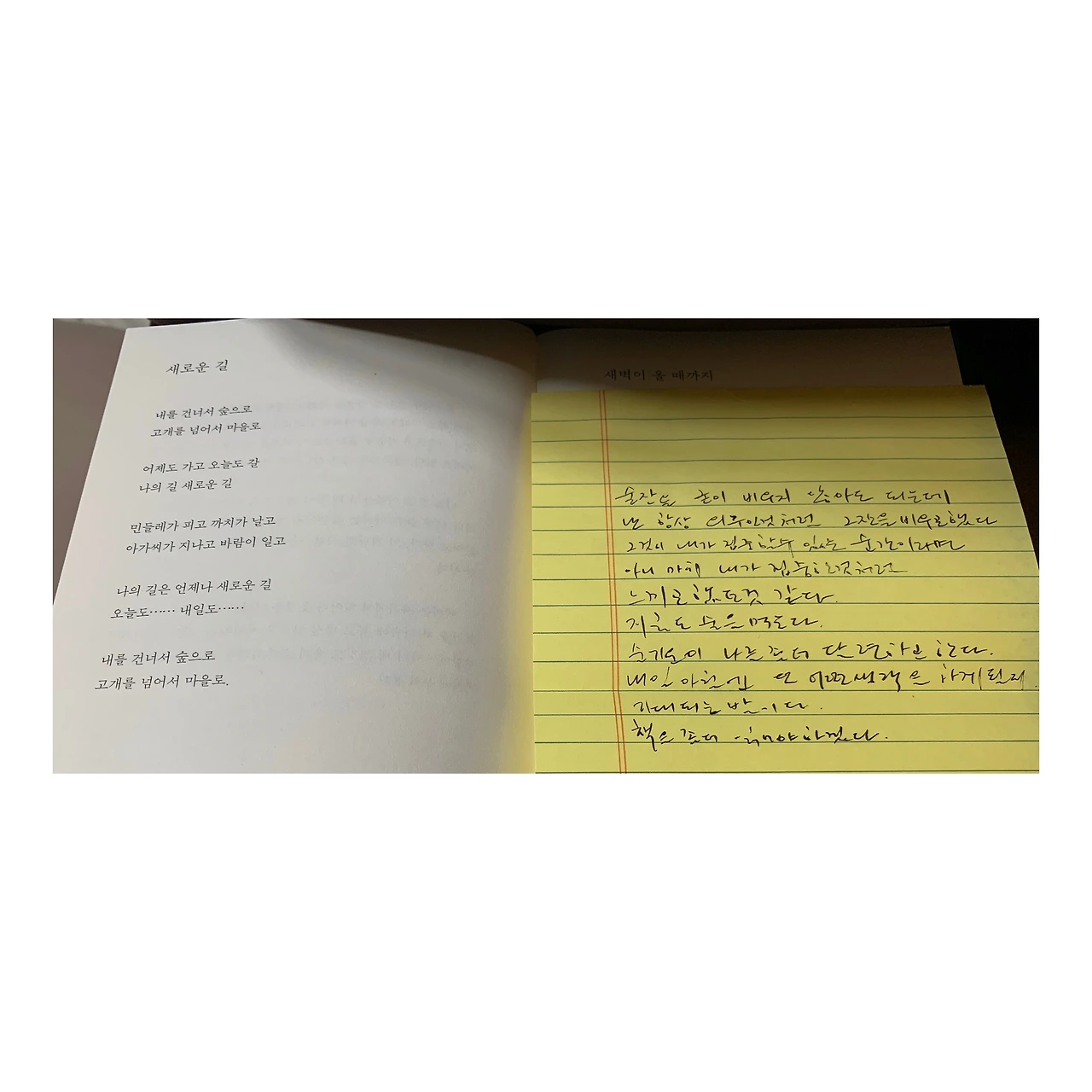 좋은 사람들과의 밤을 지새우고 아침이 되었다.마법 같은 건 오래된 메모가 시집에 놓여있었다는 것 그리고 음절 수와 관계없이 노래를 지었다는 것.새로운 길은 항상 행복으로 가득 차있다.이제 걸어야겠다.