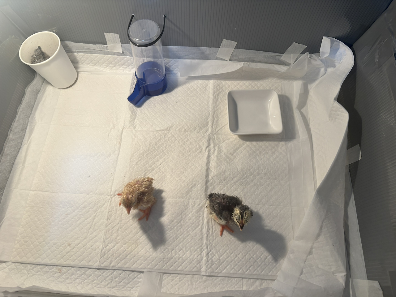 막 태어난 병아리라서 종이컵에 하루정도 담아두면 다리가 교정이 될 거예요, 종이컵에 좀 넣어주세요~'라고 하신다.