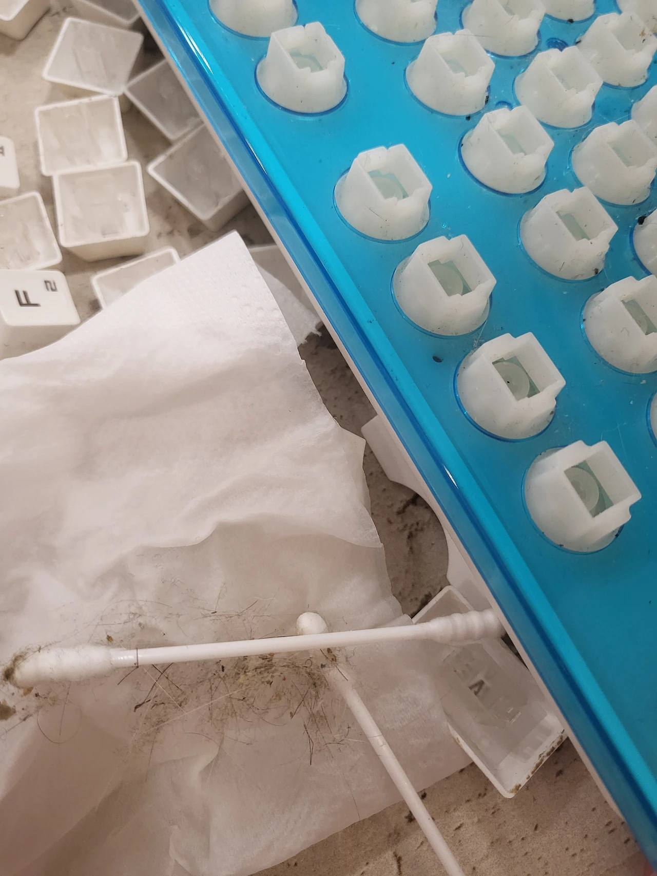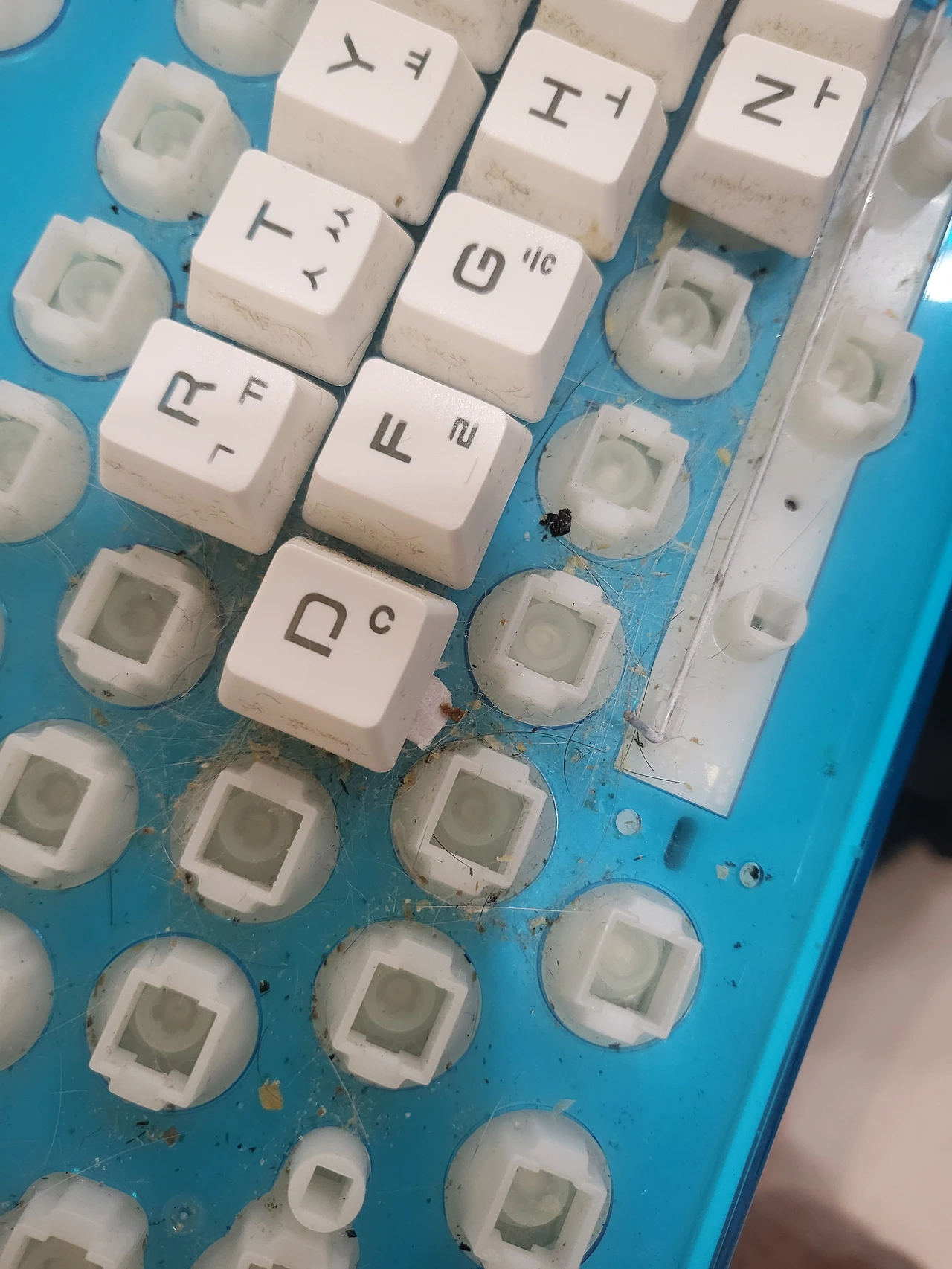 문제는 그 사이를 모두 닦아냈는데,저 사진상 파란색 플라스틱 커버와 키보드 사이에 까만 먼지들이 들어가 있어서 닦아낼 수 없는 부분이 있었던 것이다.