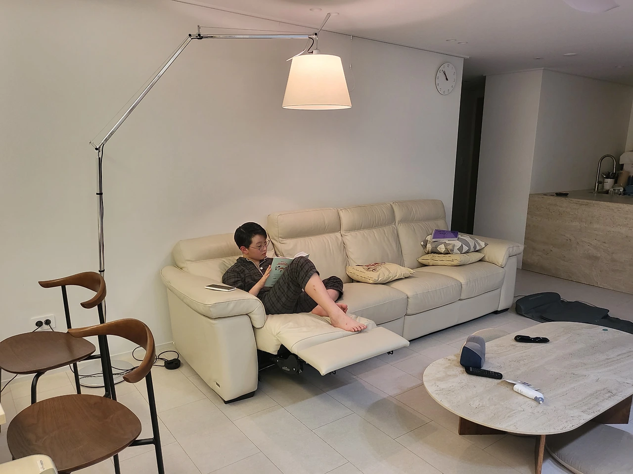 사실 참 식빵처럼 생겨서 미적으로는 끌리지 않았지만 눕는 순간 몸을 구름처럼 포근하게 안아줘서 선택했던 저 소파 덕인지 내가 예상한 그림은 아니었다. 귀신같이 눈치가 빠른 아들도 "엄마, 막 우리 집에 막 엄청 잘 어울리지는 않네?" 옆에서 팩트 폭격 해댄다.