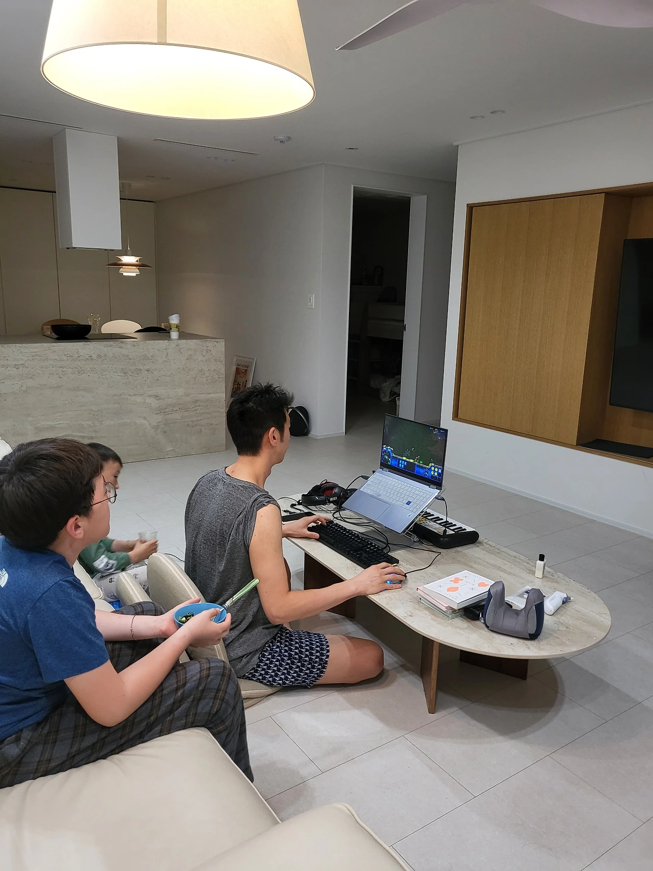 어쩌면 조명이 안 어울린다기보다 내가 그린 이상적인 그림이 아닌 이유는 남편이 영롱한 조명 아래에서 '아빠 스타하는 거 봐라!!' 하며 양쪽에 아들들을 앉혀두고 게임에 열을 올리기 때문인지도 모른다.