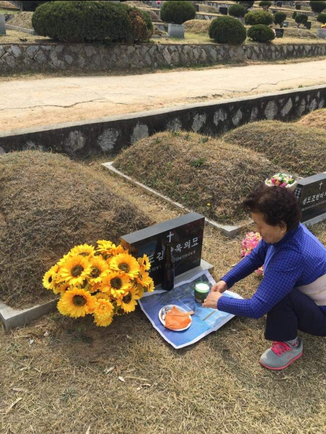 나는 노란 국화와 해바라기를 준비해 갔고 어머님은 맥주와 오징어를 준비해 오셨다.