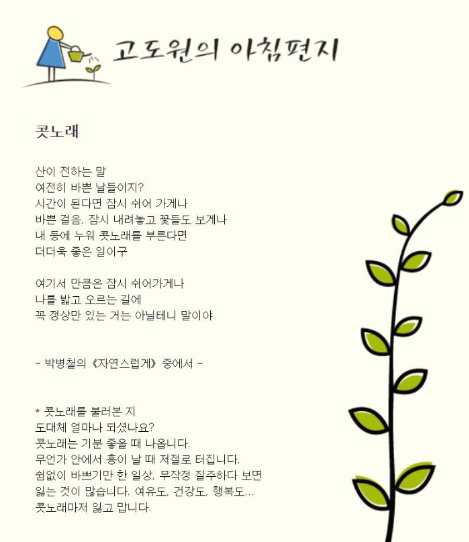 치열하게 살아왔던 삶, 그리고 본인이 간절하게 원했던 일들을 이뤘지만 뇌졸중 전조현상으로 인생의 전환기를 맞게 되고 그 이후 꿈의 길을 걷기 시작하면서 고도원의 아침편지를 시작했다고 한다.