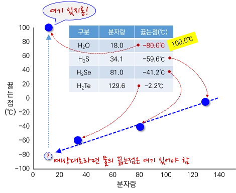 그림을 보면서 설명하는게 이해가 쉬울 것 같다. 그림에서 보는 것처럼 물을 제외한 나머지 화합물의 끓는점은 우리가 예상한 대로 착착 들어맞는다. 그리고, 그 예상대로라면 물의 끓는점은 영하 80℃ 근처 어딘가에 있어야 하지만 물의 끓는점은 거기에 없다. 그것보다 한참 높은 100℃에 올라가 있다.