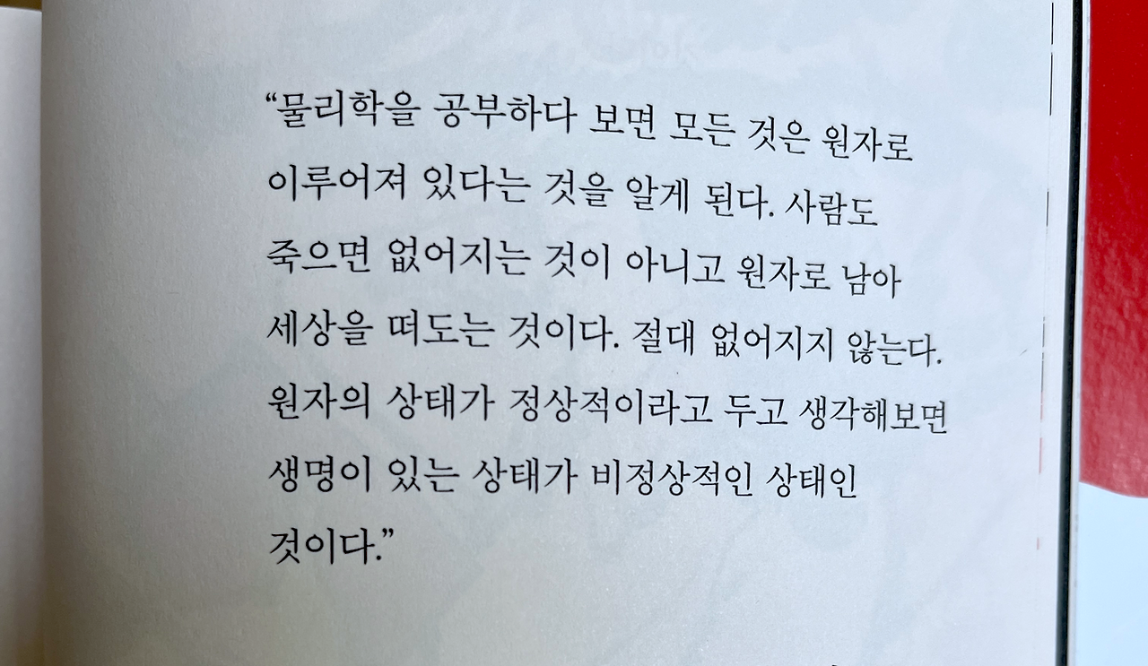 최근 들었던 말 중에서 가장 마음에 와닿았던 말은, 죽음 이후 그 물질은 사라지는 것이 아니라 공기 중의 원자가 되어 사라지지 않는다라는 것.