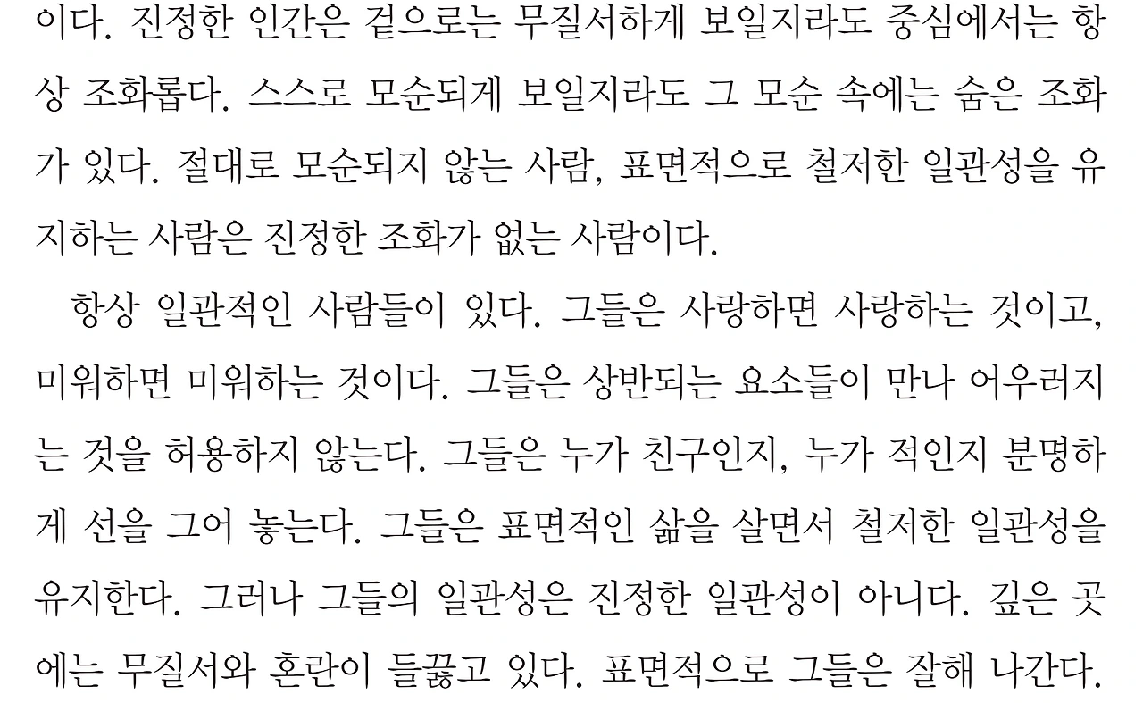 흔들리는 사람이 더 조화로운 상태이다. 일관된 사람은 오히려 혼란 속에 있다.
