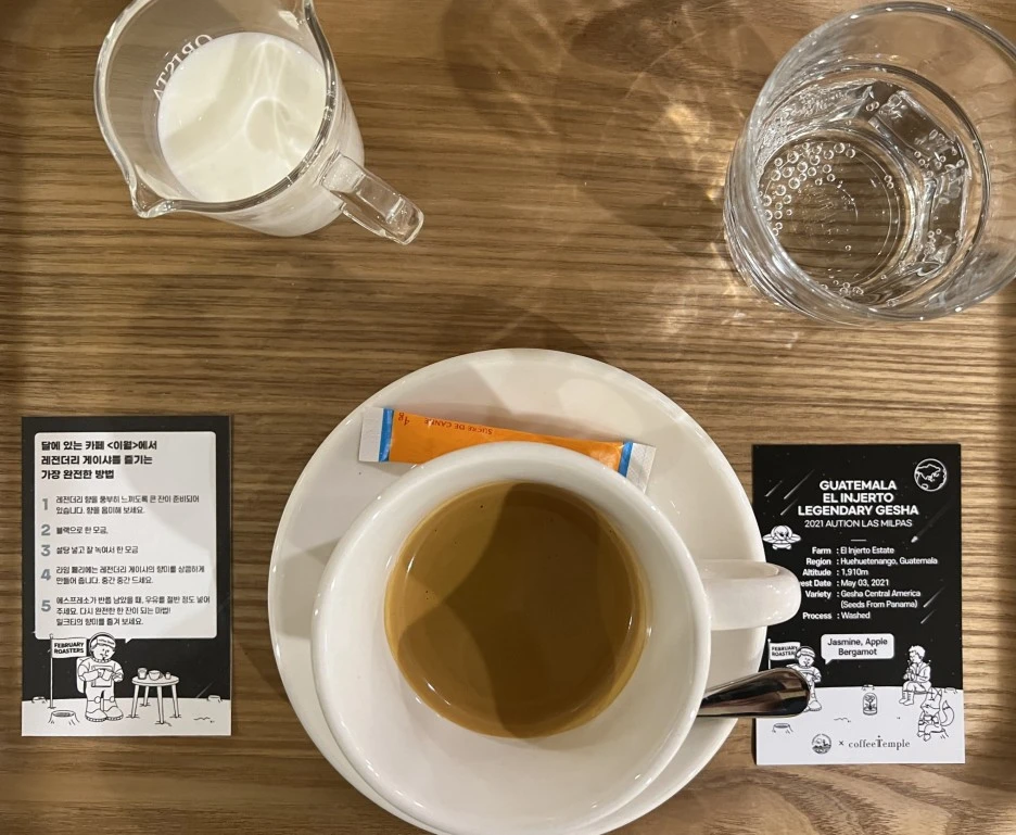 왜 이렇게 코스 3을 만들었는지에 대해서 김사홍 바리스타님께 물어봤다. 이유인즉, 이 커피를 가장 맛있게 마시는 방법을 함께 연구하다가 한쪽은 우유와 함께 마시는 것이 그리고 다른 한쪽은 에스프레소만 즐기는 것이 가장 맛있다고 의견이 갈렸기 때문이었다. 그래서 두 방식 모두 가져가자고 결론이 나와서 에스프레소의 양을 늘려 두 방식과 그리고 페리에 라임으로 세 음료까지도 돼버린 코스 3이 탄생하게 되었다는 것이다.