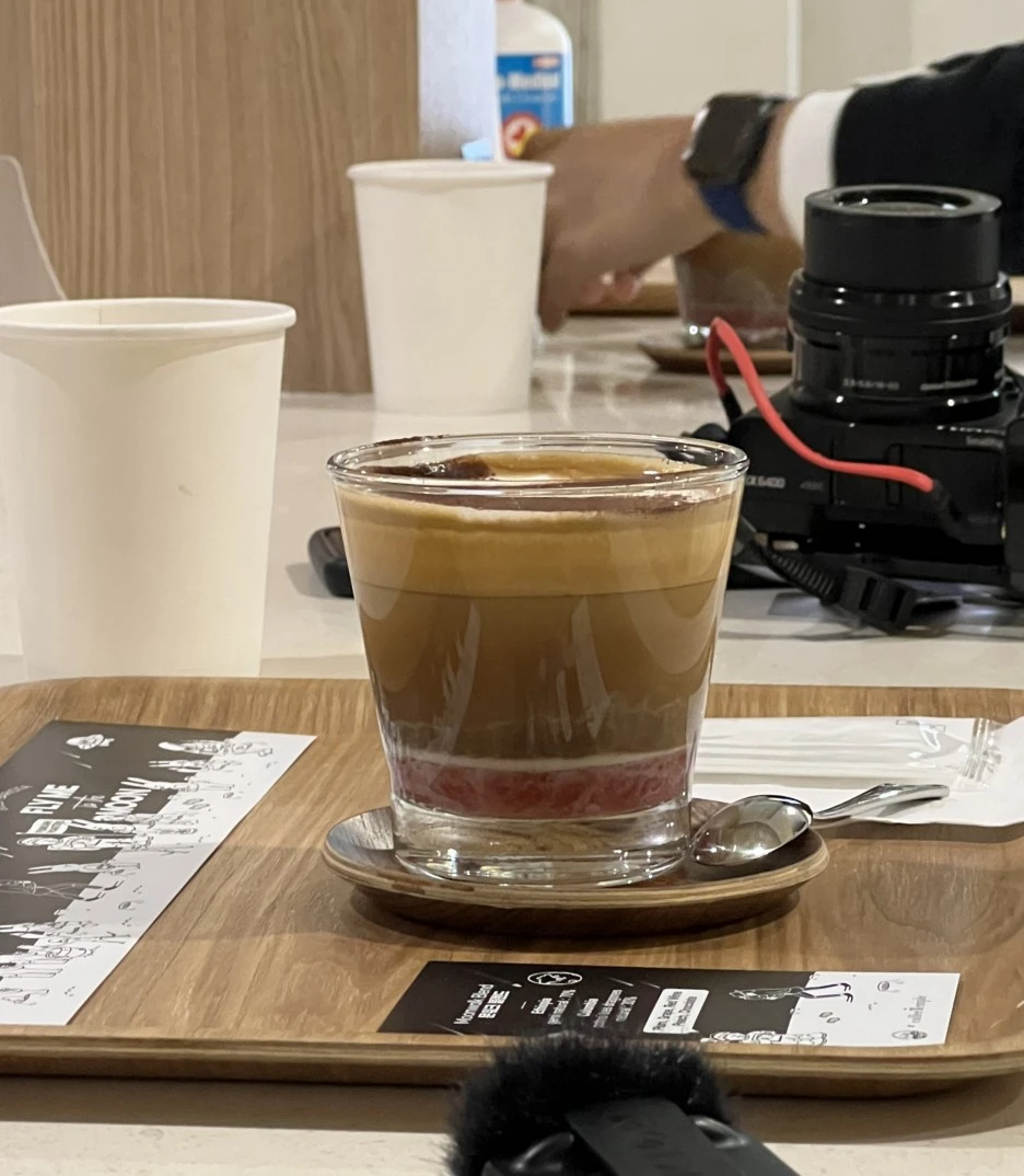 하지만 이 커피는 맛있었다. 더 구체적으로 말하면 전 커피에 느꼈던 오렌지의 산미와 딸기 뉘앙스의 단맛이 있었기 때문에 거북하지 않고 맛있게 즐길 수 있었다. 문워크 크림치즈라떼를 어떻게 하면 맛있게 즐길 수 있는지에 대해서 직원분께서도 너무 친절하게 소개해 주셨다. 직원분은 고급 진 "딸기맛 미니쉘"이라는 표현을 사용했다. 아래 깔린 딸기청(?)이 '생딸기였다면 어땠을까?' 생각이 들기도 했지만 딸기의 무른 식감이 크림과 우유와 더 잘 어울리지 않았나 싶다.