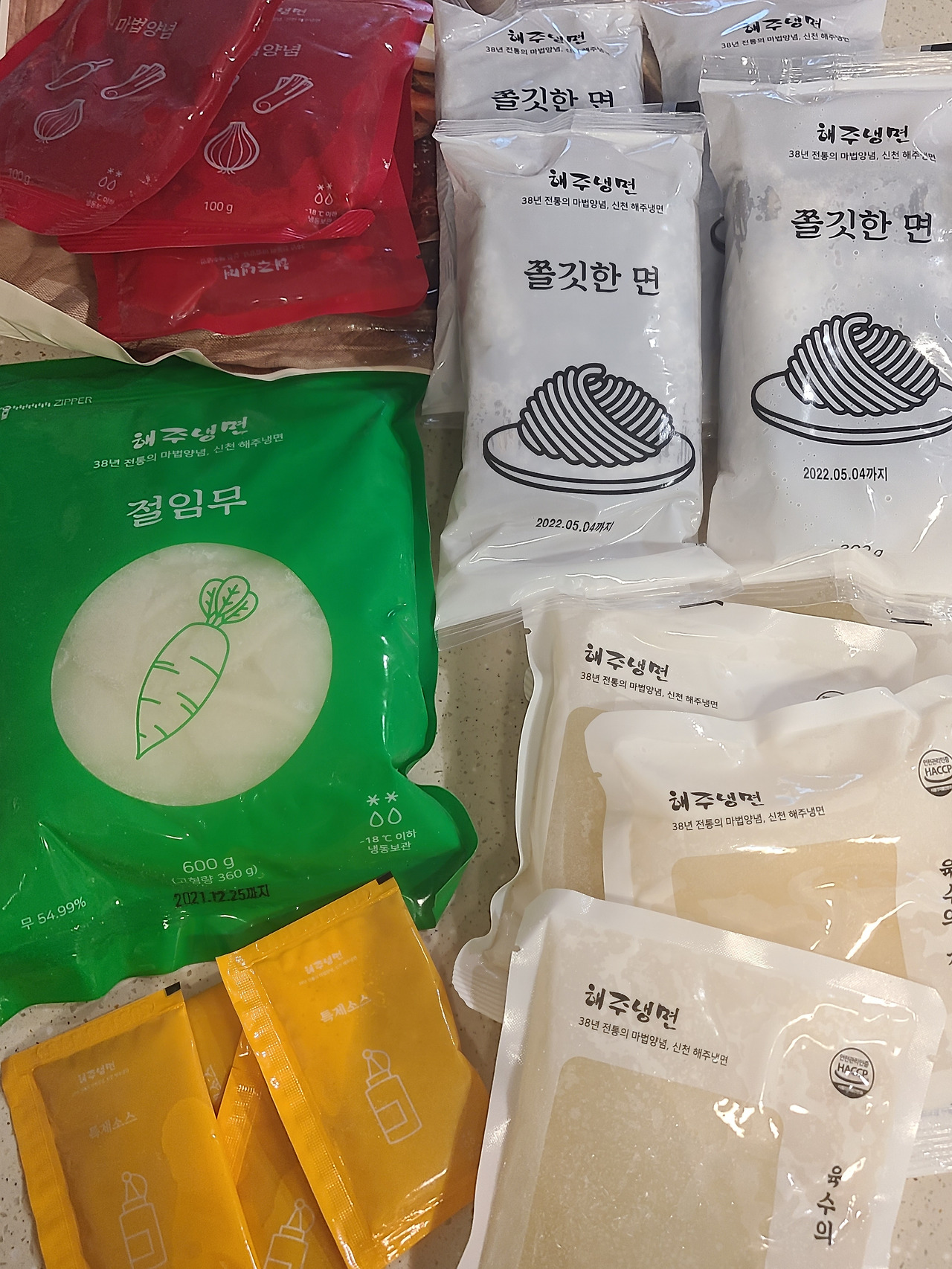 38년 전통의 마법 양념, 신천 해주 냉면! 겉봉투에 쓰여있는 그 문구를 보니 잠실 신천의 그 해주 냉면이 맞나 싶고 반가운 마음에 하나 꺼냈다. 신천에서 매운 냉면으로 유명한 해주 냉면... 결혼 전까지 부천에 살던 내가 서울 신천의 해주 냉면을 알게 된 건 대학 친구들 K와 O 때문이었다.