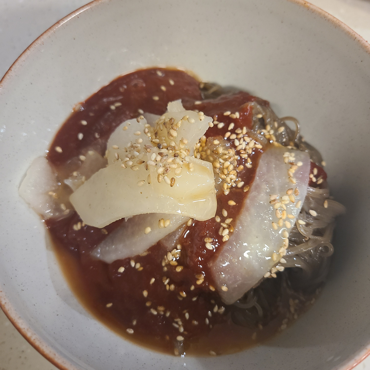 내가 그날 코스트코 냉동고에서 본 해주 냉면이라는 글씨는 냉면의 맛에 대한 기억과 함께 쓰라린 기억까지 되새기게 했다. 한동안 잊고 있었던 그 맛... 다시 마주하면 어떨까... 집에 오면서 그 맛이 궁금해 견딜 수가 없었다. 냉동이라는 게 조금 마음에 걸렸지만 뒤에 적힌 레시피대로 조리했다. 매운 냉면을 먹기 전에 위를 보호해 줄 계란 반쪽은 없었지만 그릇에 담고 사진도 찍어 본다.
