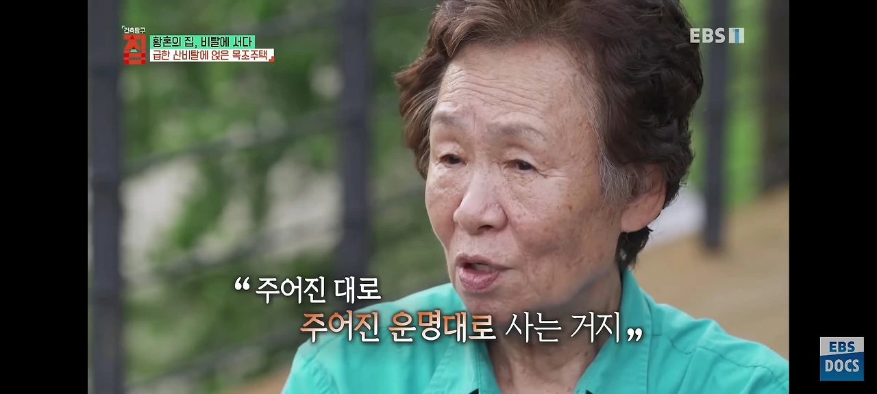 30대에 남편과 사별하고 자식들 키우며 혼자 살아오신 이재수 할머니... 주어진 대로 가정을 지키기 위해 열심히 살아오셨고, 2006년 경기도 가평에 노후를 보내기 위해 집을 지으셨다고 한다. 할머니 연세에 계단을 오르내리는 게 힘들게 보이고 큰 집에 혼자 사시는 게 외로워 보였지만 할머니에게 이 집은 마음의 여유를 찾게 해 준 집이라고 한다. 각박한데 살았으면 더 힘들었을지 모른다고... 이제는 더 소중한 게 세월이니, 잠깐 비추는 햇빛, 눈 내리는 겨울날의 온기 이런 것들은 경제적 가치와 바꿀 수 없는 행복이라고 말씀하시는 할머니... 인위적으로 경사면을 깎지 않고 자연이 허락하는 범위에서 집을 지으셨던 그 마음처럼 주어진 것들을 소중하게 여기는 모습이 기억에 남았다.