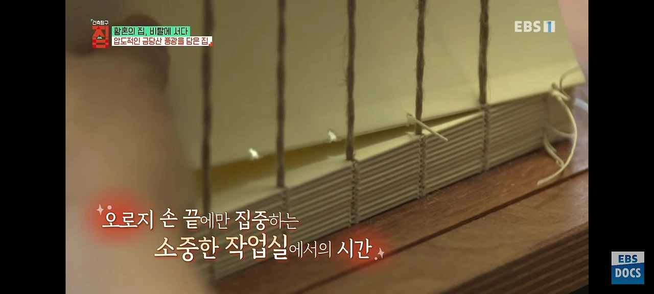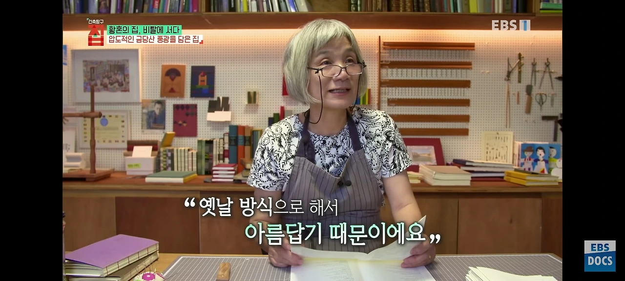 보기에도 시간과 정성이 많이 들어가는 작업... 예술제본이라는 분야가 생소했지만 너무 특별해 보여서 오히려 집 소개보다 더 뚫어지게 봤던 것 같다. 아파트에서 작업할 때보다 소음 신경 안 쓰고 마음껏 할 수 있어서 너무 만족한다고 말씀하시는 할머니 모습이 소녀 같고 예뻐 보였다. 어떤 계기로 그 일을 시작하셨는지에 대해서는 방송에서 자세히 나오지 않았지만 어쩌면 늦었다고 생각되는 그 나이에 새로운 일에 도전하시고 지금까지도 만족하며 작업에 몰두하시는 모습이 젊은이들의 모습보다 더 열정적으로 보여 기억에 더 남는지도 모르겠다.