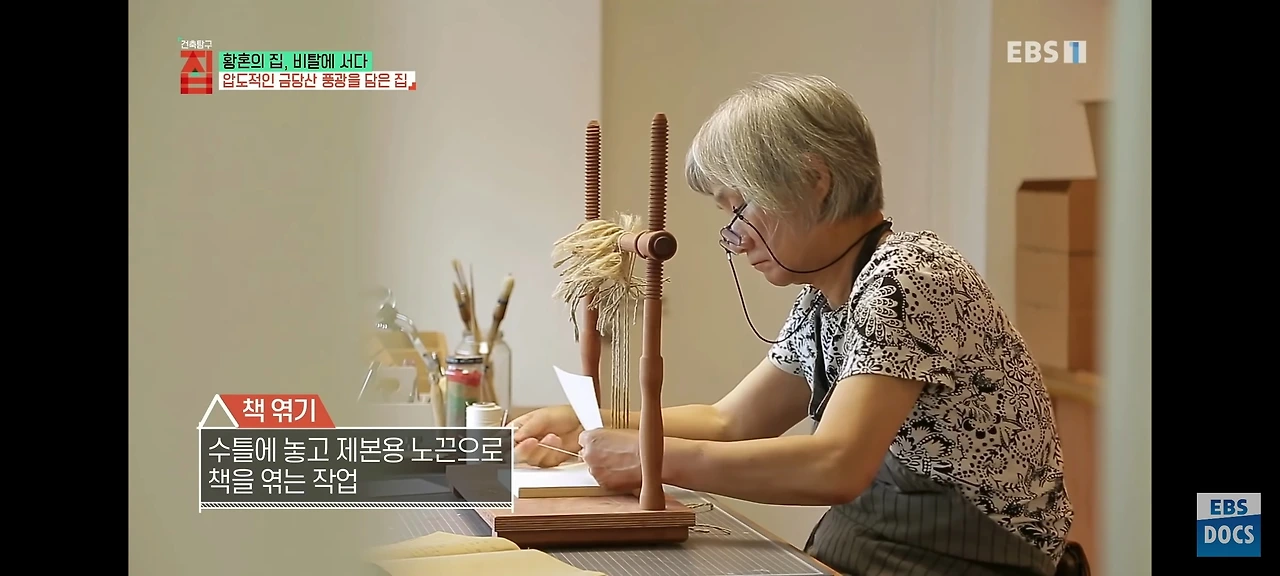 두 분의 집에서 내가 가장 마음에 들었던 공간은 예술제본을 하시는 박성희 님의 작업실... 방송을 통해 '예술제본'이라는 단어를 처음 접했다. 예술제본은 '인쇄된 책이나 낱장의 기록물을 견고하고 아름답게 엮어 오래 보존할 수 있도록 하는 제본 방식'을 말하는데 박성희 님은 50세가 넘어서 예술제본을 배우셨다고 한다.