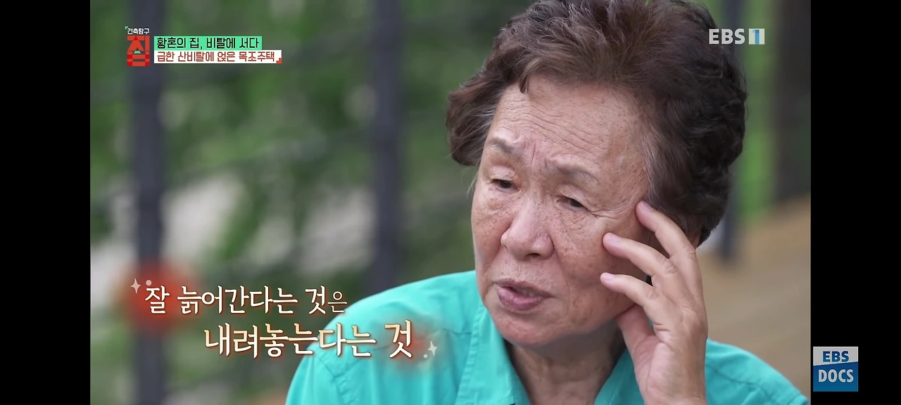 '잘 늙어간다는 것은 내려놓는다는 것'... 삶의 순간순간을 소중하게 느끼며 사는 삶은 누가 만들어 주는 것이 아닌 나 스스로 만들어야 하는 것이다. 남들이 보기엔 큰 집에서 혼자 사시는 모습이 쓸쓸해 보일지 몰라도 30대에 사별하고 자식들을 키우기 위해 그 모질고 긴 시간들을 버텨오신 할머니는 15년째 그 집을 가꾸시면서 할머니만의 쉼이 있는 편안한 시간을 만들고 계셨다.