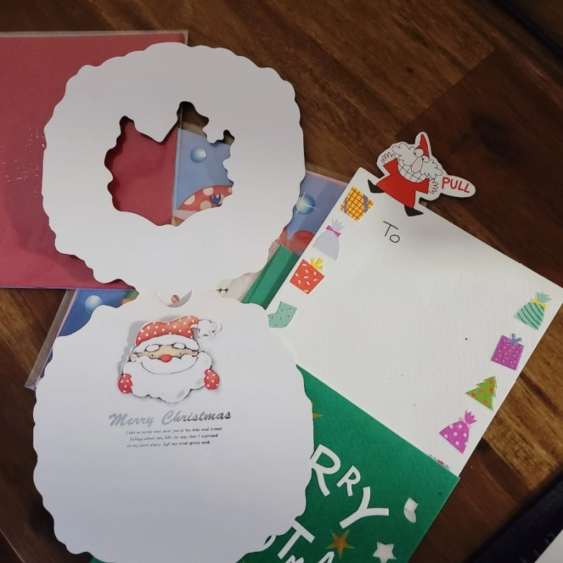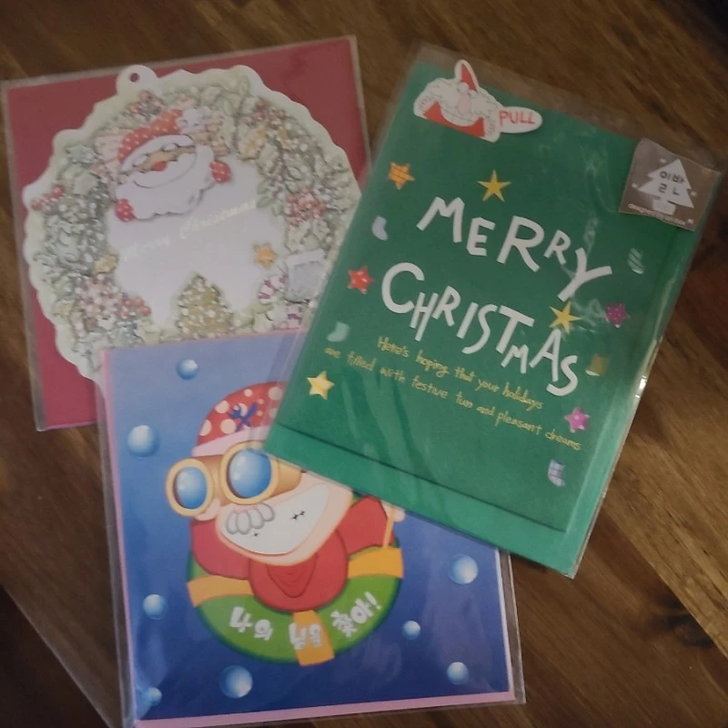 부랴부랴 준비한 음식들로 가족끼리 건배를 하고 생일 축하 인사를 건넸다. 선물은 미리 코트를 사줬으니 그날 따로 오고 가는 건 없었고 신랑도 나도 아이들에게 크리스마스 카드만 건넸다. 신랑은 카드를 사러 몇 군데를 다녔다는데, 난 중고등 학생 때 사서 여태 보관했던 크리스마스 카드를 꺼냈다. 세월이 지났지만 그래도 무난한 것들로...