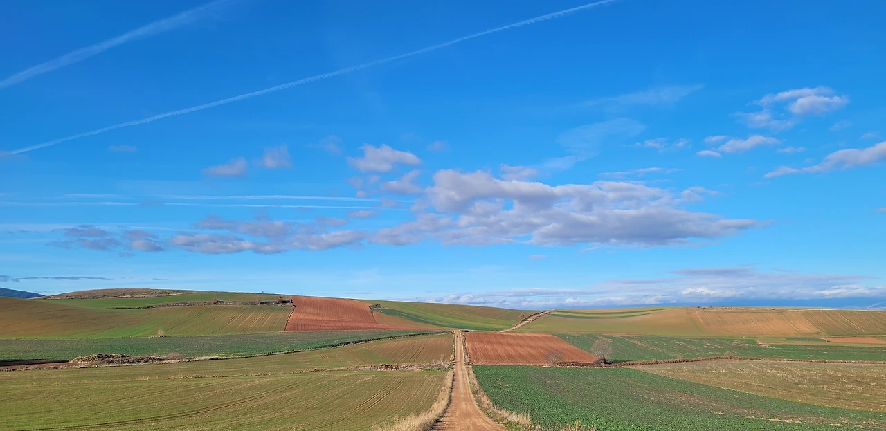 메세타 고원처럼 몇 시간 동안 나무 하나 없는 평평한 들판을 걸어야 하는 싱거운 맛의 길도 있다. 오늘처럼 푸른 하늘, 한 뼘만큼 자란 초록밀밭, 내년을 준비하기 위해 갈아놓은 거대한 농지가 한 폭의 그림 속에 조화롭게 들어와 있어 감탄이 절로 나오는 달콤한 맛의 길도 있다.