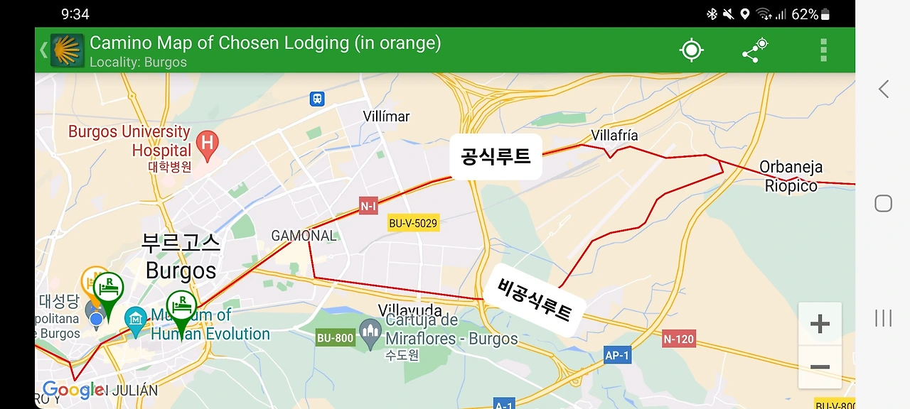 그날따라 햇볕도 유독 강해 오후로 접어들수록 온몸이 지쳐갔다. 하지만두 눈을 부릅뜨고 표식을 확인하며 걸었다. 그런데 어디에서부터 잘못된 것인지 블로거가 말한 개고생길을어느 순간 걷고 있는 게 아닌가. 브루고스 앞마을(Orbaneja Riopico)부터 숙소가 있는 부르고스 대성당근처까지 10km가 넘게 뜨겁게 달궈진 아지랑이 피는 아스팔트 도로를 따라 몇 시간을 걸은것이다.결국 도착할 때는 한걸음도 더 옮기기 어려울 정도로 만신창이가 되었고, 시간이 너무 늦어 공립 알베르게는 들어갈 수가 없어 비싼 호텔을 잡아야 했었다.
