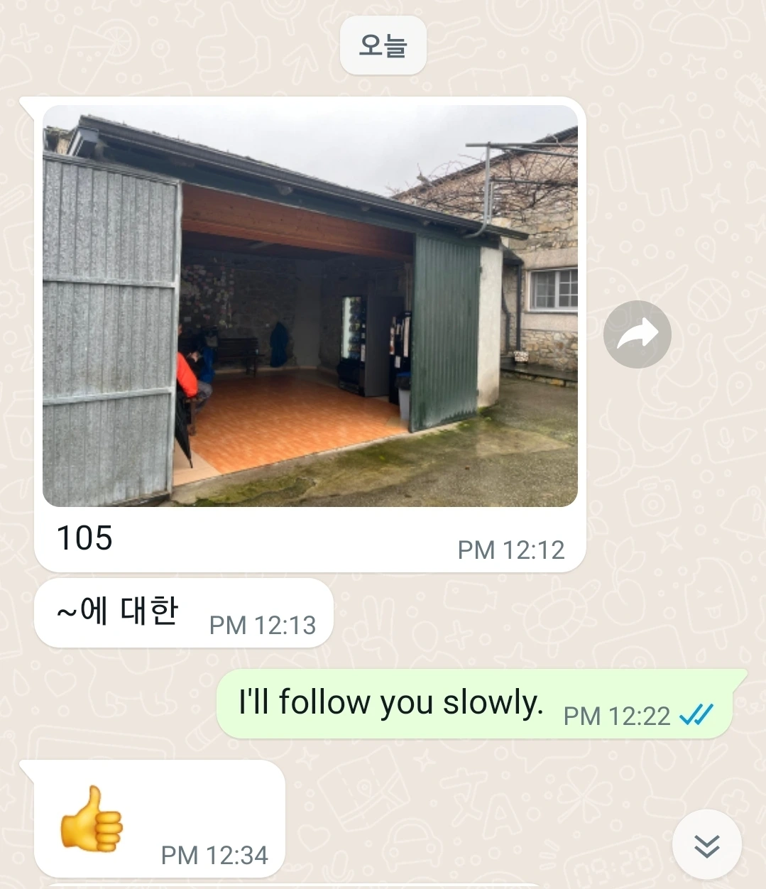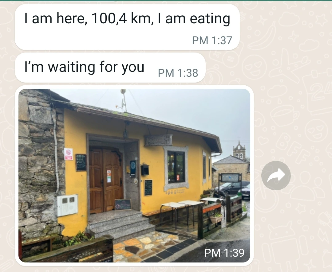 사진을 찍으려고 바지주머니에서 폰을 꺼냈더니 그가 보낸 왓츠앱 메시지가 와 있다. 본인은 (산티아고까지) 105km 남은 지점의 간이쉼터에 있다는 글과 사진이었다. 바로 답장을 보냈다.