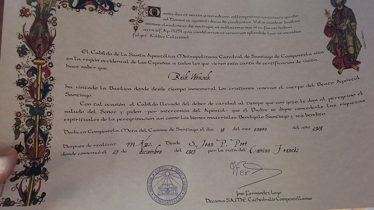 12월 23일 생장에서 시작한 두 번째 까미노는 해가 바뀐 1월 18일 산티아고에 도착하는 것으로 프랑스길 완주를 했으며 그것을 스페인에서 증명해 주었다.