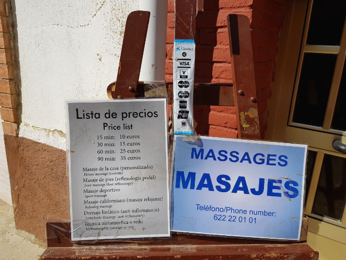 저녁을 먹고나서 미리 예약한 마사지를 받으러 갔다. 브루고스를 가기 위해 45km 정도를 걸었던 날에 꼭 마사지를 받고 싶었는데 장 보고 저녁 식사 하느라 정작 마사지를 받지 못 했다. 오늘 제대로 쉬지도 못하고 정말 힘겹게 내리 17km를 걷고 숙소가 있는 마을에 도착했는데 가장 먼저 눈에 들어온 게 마을 입구에 있는 마사지 광고판이었다.