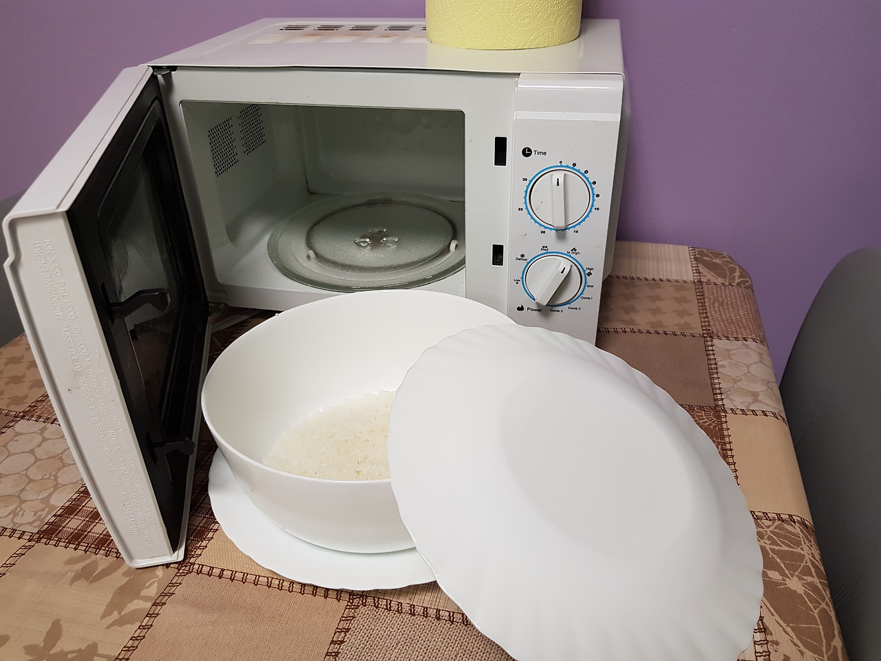 1. 불린 쌀을 큰 그릇(작은 그릇은 밥물이 넘쳐서 전자레인지를 청소해야 하니 큰 그릇이 좋다)에 담고, 전자렌지를 가장 센 것(가정용은 700w정도 됨)으로 설정하여 5분을 돌림. 확인해보면 밥물이 끓어 쌀이 조금 익은 것이 보임.