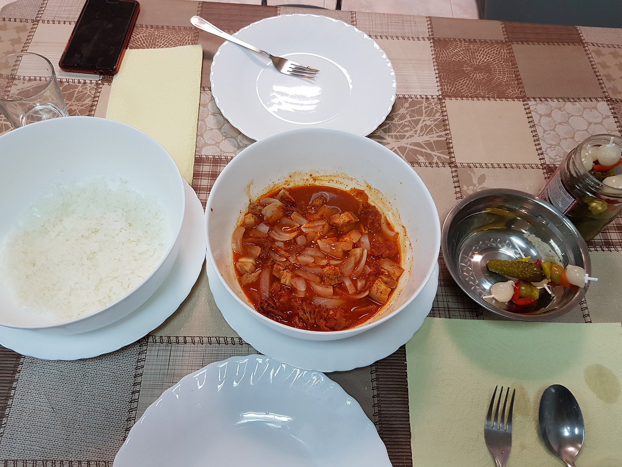 잠시 멍하니 있다가 번쩍 아이디어가 떠올랐다. 포털사이트에 ‘돼지고기 김치찜 전자레인지’, ‘전자레인지 밥하기’를 검색했다. 둘 다 해 본 블러거들의 글이 많이 올라와 있었다. 서양은 국물요리가 거의 없어서 그런지 우리나라처럼 오목한 그릇이 없는데 다행히 큰 (커도 너무 큰)대접 같은 그릇이 두 개가 있어서 그걸 이용해 밥도 하고 김치찜도 만들었다. 그러고 나서 상을 차려 주방 앞쪽 데스크에서 근무하고 있는 여직원을 불러 “한국 음식 좀 맛보세요”라고 했더니 처음엔 “저녁을 이미 먹어서 배불러요”라며 사양해서 “조금만 드셔 보세요”라고 재차 권유했더니 와서 식탁에 앉는다.