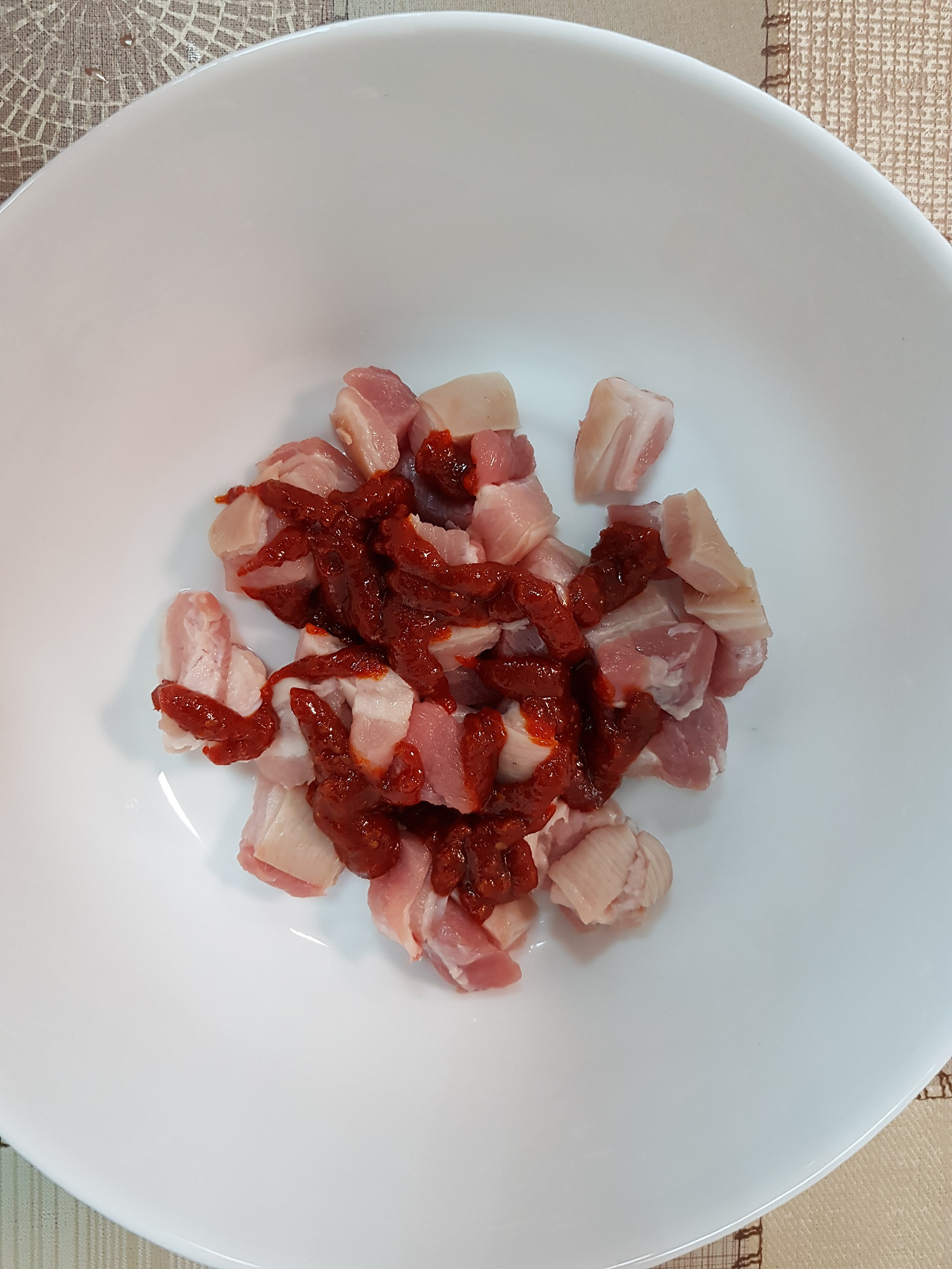 8. 돼지고기에 간단히 양념을 함. 양념은 취향에 따라 다르나 후추, 설탕, 고추장, 마늘 등을 넣으면 좋음.