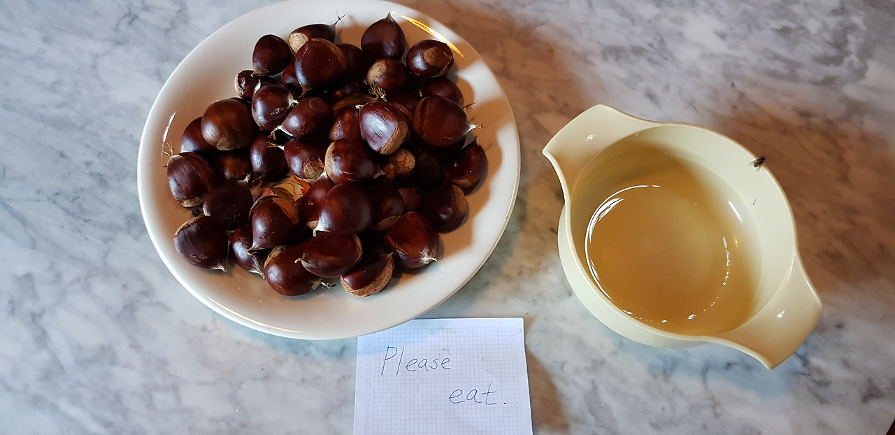 주운 밤을 큰 솥에 쏟고 물을 부었다. 물을 붓는 이유는 두 가지인데 하나는 속이 안 차거나 말라서 실속이 없는 것들이 둥둥 뜨게 만들기 위함이고, 다른 이유는 속에 든 밤벌레를 밖으로 나오게 하기 위해서다. 그렇게 선별한 밤 중에서 껍질이 갈라져 속이 보이는 것들은 추려서 생밤으로 깎아 먹고 나머지는 모두 삶았다.