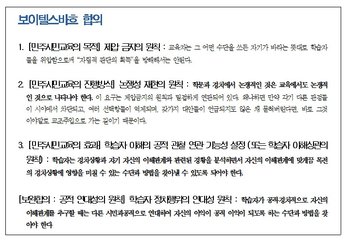 그런데 이쯤 이르면 현실정치의 실시간 체험장으로서 현장 민주시민교육의 작동구조가 문제 될 것이다. 이 점은 특히 민주시민교육의 일차적 주제가 현실정치의 현안들이고, 여기에 정치적 이해관계를 가진 정당들이 민주시민교육의 당사자로 나서야 했던 독일에서 특정 정당의 홍보 선전장으로 변질되는 것을 서로 견제해야 했던 상황에서 특히 문제가 되었던 쟁점이었다. 즉, 실제로 현실정치의 주제를 갖고 민주시민교육을 실시한다고 했을 때, 특히 현실정치 쟁점들을 다루는 현장 민주시민교육에서 학습을 기획하고 주도하는 교육사들의 학습 운영 태도는 자칫 정치적 편향성 논쟁을 야기할 우려가 있다. 이런 우려를 불식시키기 위해 독일의 정치교육단체들과 기관은 학습자들이 스스로의 성숙된 판단력으로 공정한 정치인식과 가치관을 체득하여 건강한 정치생활을 영위할 수 있는 능력과 감식안을 갖도록 1976년 ‘보이텔스바흐 합의’를 마련하였다. 그 합의안은 다음과 같이 3개 명제와 1개 보조 명제로 구성되었다.*9