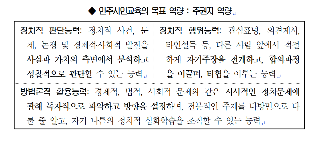 탁월한 군주의 이러한 군주 능력은 현대 민주주의 국가에서는 그 주권자인 시민의 민주시민능력 안에 그대로 이전된다. 즉, 민주시민교육이 체득시키고자 하는 것은 국가의 주권자가 이런 민주정치의 능력을 가질 경우 그 자신에게 장기적으로 유익한 법과 정책이 창출될 수 있다는 전망과 확신을 갖도록 하는 것인데, 이때 핵심은 좋은 법과 정책을 결정하는 데는 시민의 지혜와 좋은 판단력이 필수적이라는 것이다. 즉 시민의 앎의 질(質)이 민주주의의 질(質)과 국가권력의 가치를 결정한다는 것이다. 독일의 ‘정치교수법과 청소년/성인 정치교육학회’*8는 바로 이런 관점에서 민주시민교육의 목표 역량을 다음과 같이 정식화하였다.