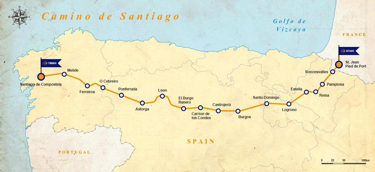 산티아고 순례길, 성 야고보의 길은 예수 그리스도의 제자 야고보가 복음을 전하려고 걸었던 길입니다. 9세기 스페인 산티아고 데 콤포스텔라에서 성 야고보의 유해가 발견되고 성 야고보를 스페인의 수호 성인으로 모시게 되면서 오늘날 순례길이 생겼습니다. <중략> 현재 대부분의 순례자는 프랑스와 스페인을 지나는 루트인 까미노 프란세스를 따라 걷습니다. 보통 까미노 프란세스는 피레네 산맥 발치의 생장피에드포르에서 출발하게 됩니다. 실제로 도보 순례자가 걷게 되는 거리는 산티아고 데 꼼뽀스뗄라까지 808킬로미터이며 피스떼라까지는 929킬로미터에 달합니다. 장거리 도보 순례인 만큼 개인차에 따라 짧게는 30일 길게는 40일이 걸리게 됩니다. 그렇기 때문에 시간이 부족한 순례자들은 이 길의 일부분을 몇 년에 나누어 걷기도 합니다. 이런 이유로 산티아고 데 꼼뽀스뗄라에 있는 순례 사무국에서는 산티아고 데 꼼뽀스뗄라까지 마지막 100km 이상을 걸은 순례자에게 꼼뽀스뗄라(Compostela; 순례완료증서)를 주고 있습니다. - 출처: 대한민국 산티아고 순례자 협회
