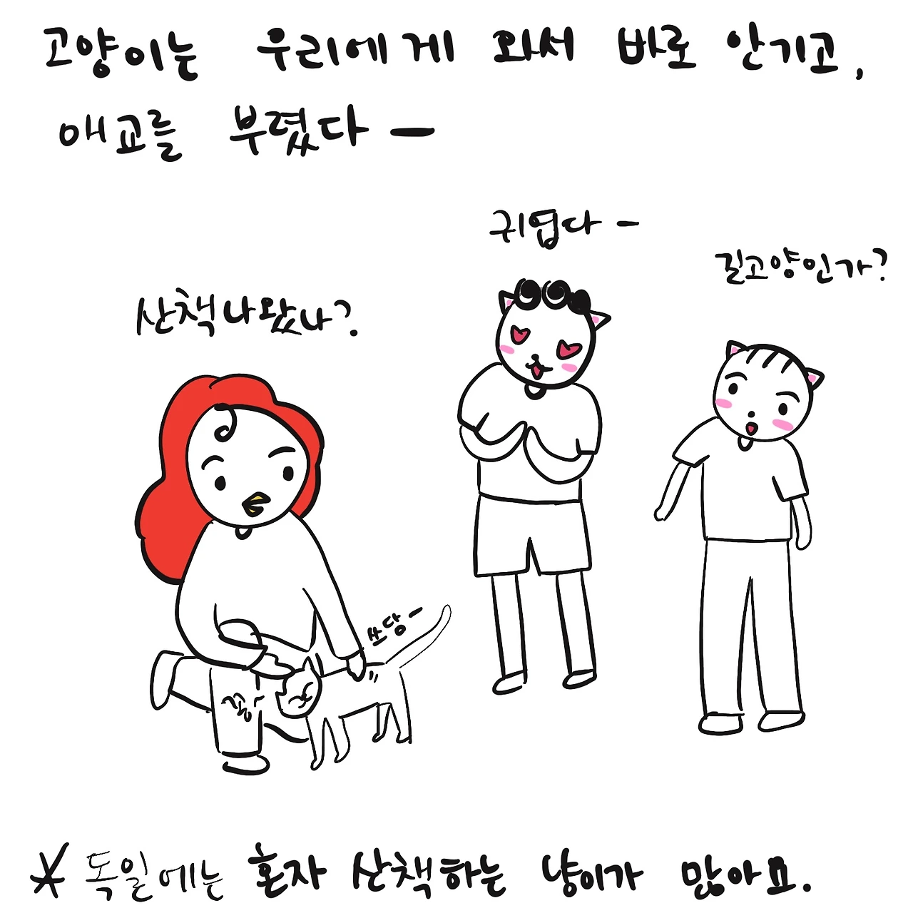 주택의 경우에는 거의 자유롭게 풀어놓고(?) 키우기때문에 집 앞 도로나 공터로 산책다니는 냥이가 많아요.
