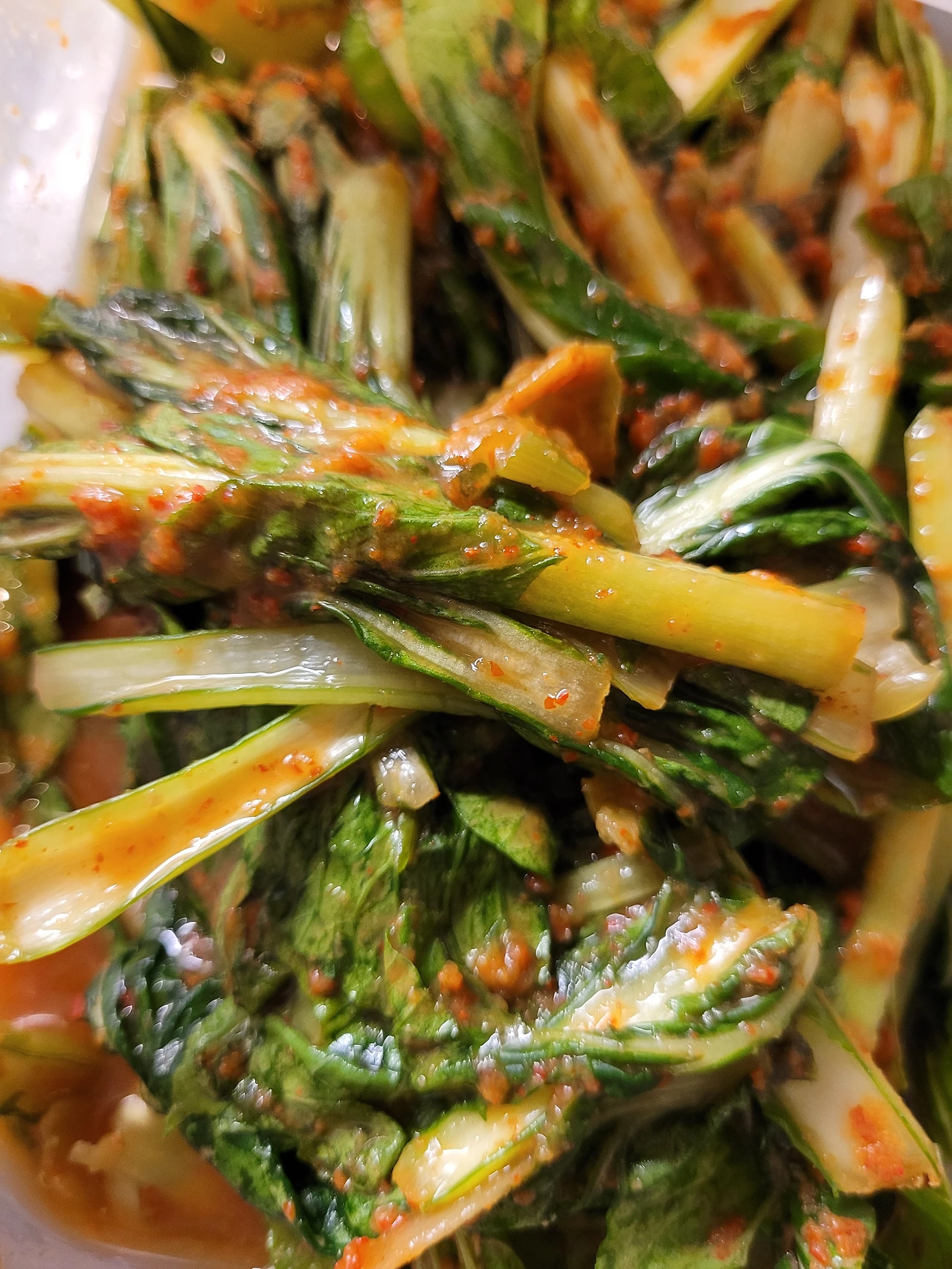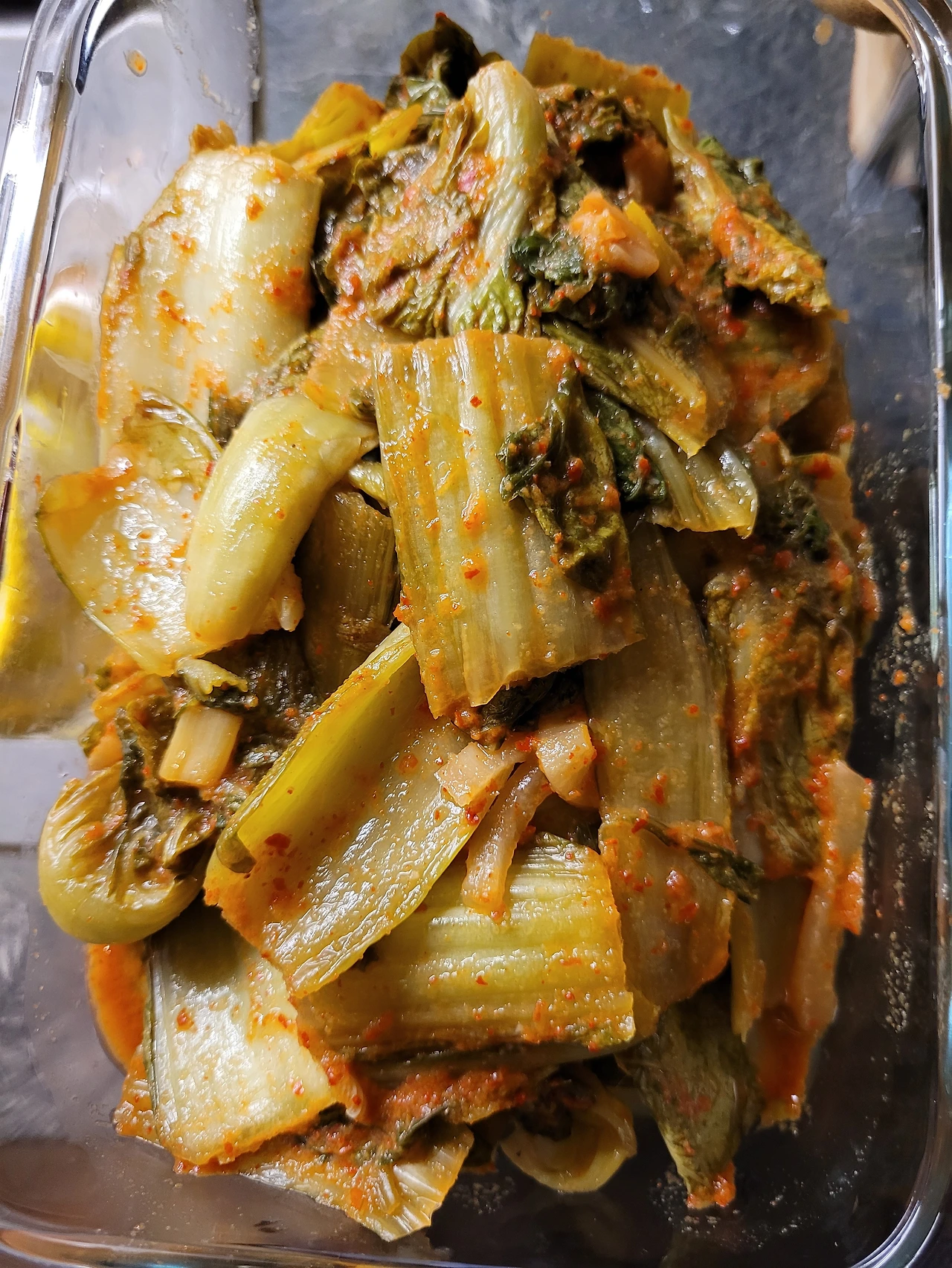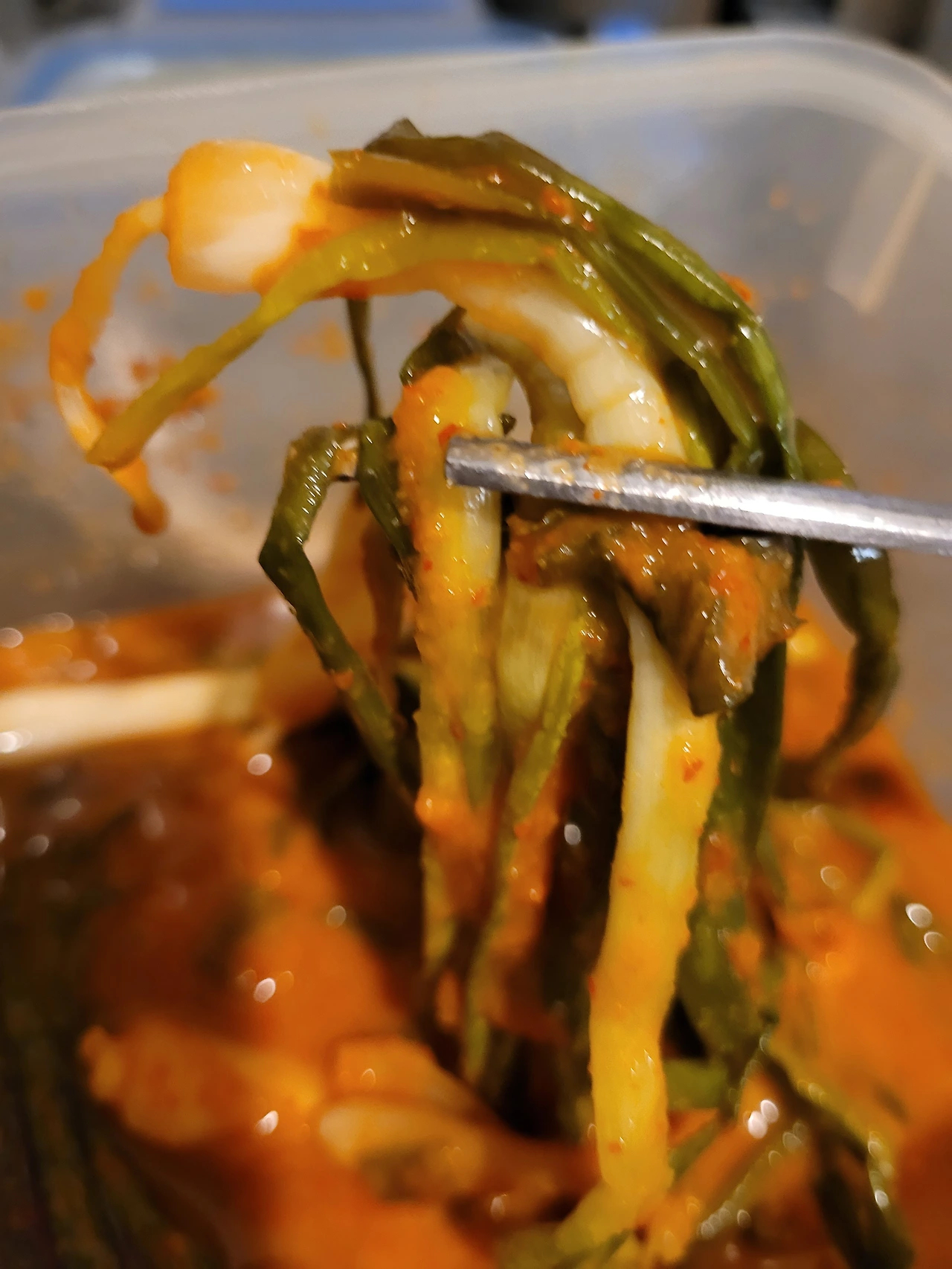 하지만 혹시 몰라 조금씩만 사서 시범 삼아 만들어봤더니 무릎을 탁 치게 되는 맛!! 고향에서 먹던 맛!!! 이 느껴졌다. 열무김치는 하루 삼시 세끼 열무비빔밥을 해먹을 정도로 맛있었고 '갓' 같은 (발음주의ㅋㅋ) 김치는 정말 갓김치 특유의 쌉싸래한 맛이 났다. 또 파김치는 한국에서 먹던 파김치 그대로였다. 맛있게 잘 익은 파김치는 바로 라면을 끓여 같이 먹었는데 와 감탄이 절로 나왔다. 내가 김치를 잘 만들어서가 아니라 한국에서 먹던 그 느낌을 그대로 느낄 수가 있어서!
