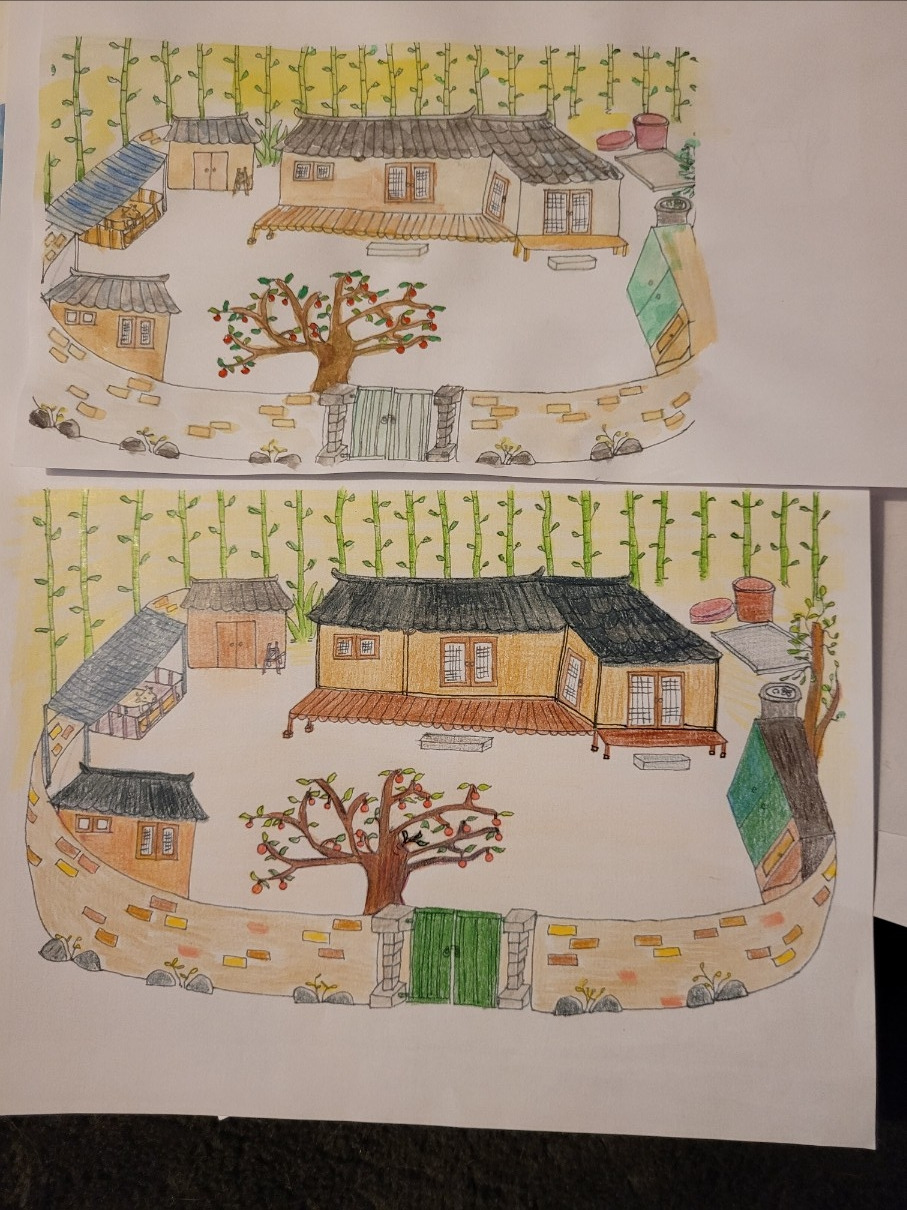 내가 기억하는 대로 망설임 없이 할머니 댁을 떠올리며 그려나갔다. 초록대문을 열고 들어가면 커다란 감나무가 나를 반기었고 정면엔 멋들어진 전통 한옷 집이 한눈에 들어왔다. 대문 옆에는 쓰레기를 태우는 공간이 있었고 그 옆엔 짚이 쌓여있었던 것 같다. 그리고 그 옆이 화장실이었는데 화장실은 푸세식이어서 매일 화장실 갈 때마다 무서웠던 기억이 난다. 이때 만해도 홍콩할매가 유행할 때라 홍콩할매가 나타날까 봐 감나무 옆 텃밭에서 쉬를 했었다. 화장실 옆에는 청록색 문의 창고가 있었는데 그곳엔 할아버지 오토바이가 주차되어 있었다. 할아버지를 떠올리면 오토바이를 타고 가던 모습이 그려진다. 그 옆엔 할머니의 작은 절구통이 있었는데 더 이상 사용하지 않아 어항처럼 사용하고 있었다. 그 안에는 물이 가득 채워져 있었고 부레옥잠이 있었다. 가끔 개구리가 출몰하기도 했다. 그 옆으로 조금만 들어가면 수돗가가 있었다. 집 뒤로는 대나무 숲이 있었고 대나무 숲 뒤로 산 하나가 떡 버티고 있었다. 날이 더울 때 뒤쪽으로 가면 그렇게 시원할 수가 없었다. 숨바꼭질하기에도 제격이었고 뱀 구멍이 있나 찾아보곤 했었다. 수돗가를 정면으로 문이 하나 있었는데 그곳은 부엌으로 들어가는 문이었다. 할머니와 엄마는 부엌과 수돗가에서 주로 머물며 가족들의 식사를 책임지셨다. 부엌문을 통과하면 왼쪽엔 작은방으로 들어가는 문이 있었고 정면에는 안방으로 들어가는 문이 있었다. 안방으로 들어서면 할아버지께서 늘 아랫목에 앉아 무언가를 읽거나 쓰고 계셨다. 할아버지께서는 늘 정갈하시고 깔끔한 모습을 유지하셨다. 식사도 늘 소식을 하셨고 항상 밥 한 숟가락을 남기셨는데 새댁이었던 엄마는 할아버지가 항상 한 숟가락을 남기시니 밥 양이 많으신가 하고 밥 양을 줄여서 드렸는데도 꼭 한 숟가락씩 남기셨다고 한다. 그만큼 자기 관리를 잘하시는 분이셨던 것 같다. 안방에는 지금으로 말하면 붙박이장이 있었다. 붙박이장에는 이불, 서류 등을 보관하는 장소로 사용되었는데 어린 나에게는 숨바꼭질 장소 중 하나였다. 할아버지가 앉아계시던 자리 왼쪽은 마당을 나가는 문, 즉 안방의 정문이 있었다. 그 문을 열면 마루가 나왔고 마당과 대문 옆에 자리한 감나무와 하늘, 마을 풍경을 한눈에 볼 수 있었다. 자동차 3대가 들어와도 자리가 넉넉할 정도로 커다란 마당이었다. 그리고 안방에서 연결된 문을 지나면 광이 있었는데 광에는 곡식, 먹거리 등이 보관되어 있었다. 할머니가 광에 들어가실 때마다 맛있는 게 먹고 싶어서 쫄래쫄래 따라 들어가 곶감이나, 쌀과자를 얻어먹곤 했었다. 광에도 마루로 나갈 수 있는 문이 있었다. 광 옆에는 작은 집이 또 하나 있었던 기억이 난다. 아마 별채였으리라 짐작한다. 증조할머니가 머물던 곳이었다고 한다. 그리고 그 옆 쪽으로는 소 외양간이 있었다. 개도 있었다. 그 옆에는 소여물이 쌓여있었던 기억이 어렴풋이 난다. 또 그 옆에는 부엌 아궁이가 딸린 사랑채가 있었다. 우리 부모님은 이곳에서 신혼을 시작하셨다. 훗날에는 작은 아빠가 결혼을 하시면서 부모님은 작은방으로 거처를 옮기셨고 사랑채에서는 작은 아빠와 작은 엄마가 신혼 생활을 하셨다. 할머니 댁은 조용할 날 없이 늘 사람들로 북적였다. 식구도 많았을뿐더러 발이 넓은 할아버지 탓에 동네 사람들의 방문도 잦았다. 그래서 엄마는 손에 물 마를 날이 없으셨다. 나도 한 두어 번 거들었던 기억이 나는 게, 할아버지 친구분이 방문하셔서 술상을 봐오라 하셨고 엄마와 함께 고사리같은 손으로 안주로 먹을 김치와 소주잔을 놓았던 기억이 난다. 그리고 할아버지가 바다에서 낚시해서 잡아온 운저리 생선 무침이 있었다. 마루에서 담소를 나누는 할아버지 옆에서 나는 처마에 지어진 제비집을 구경하거나 집 이리저리 다니며 놀거리를 찾곤 했었다.