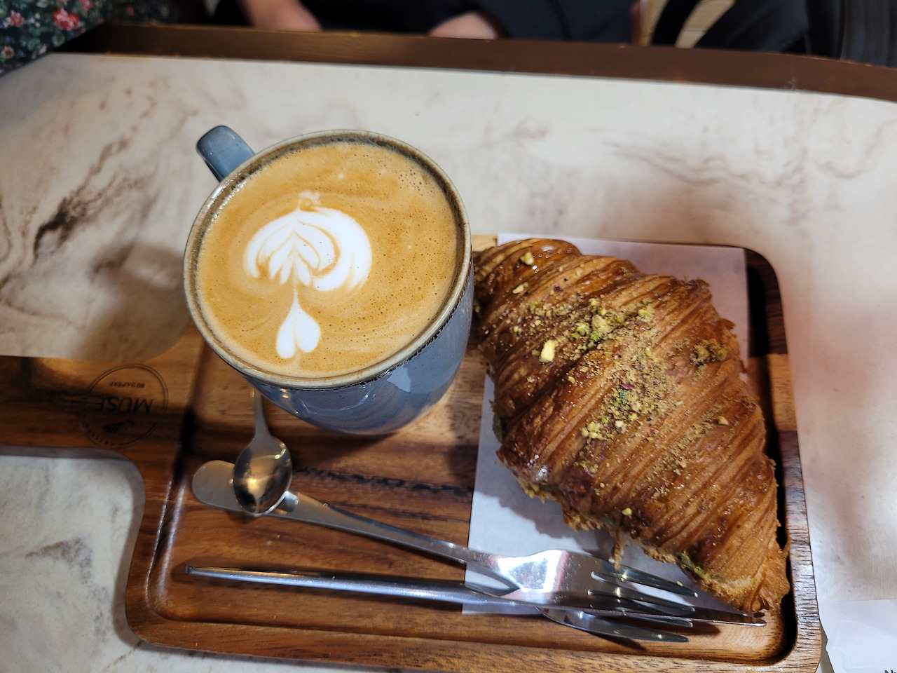 마지막 날 아침에는 어제 먹고 남아서 포장해 온 궁중 떡볶이를 먹고 숙소 체크아웃을 했다. 공항으로 가는 길에 전날 간식으로 사 먹었던 크루아상 가게가 맛있어서 재방문했다. 프랑스 음악과 인테리어가 잘 어우러진 여자들이 좋아하는 분위기의 카페였다. 무엇보다 피스타치오 크루아상이랑 블루베리크림치즈 크루아상이 맛있었다. 여행 중 먹었던 음식 중 최고!!!