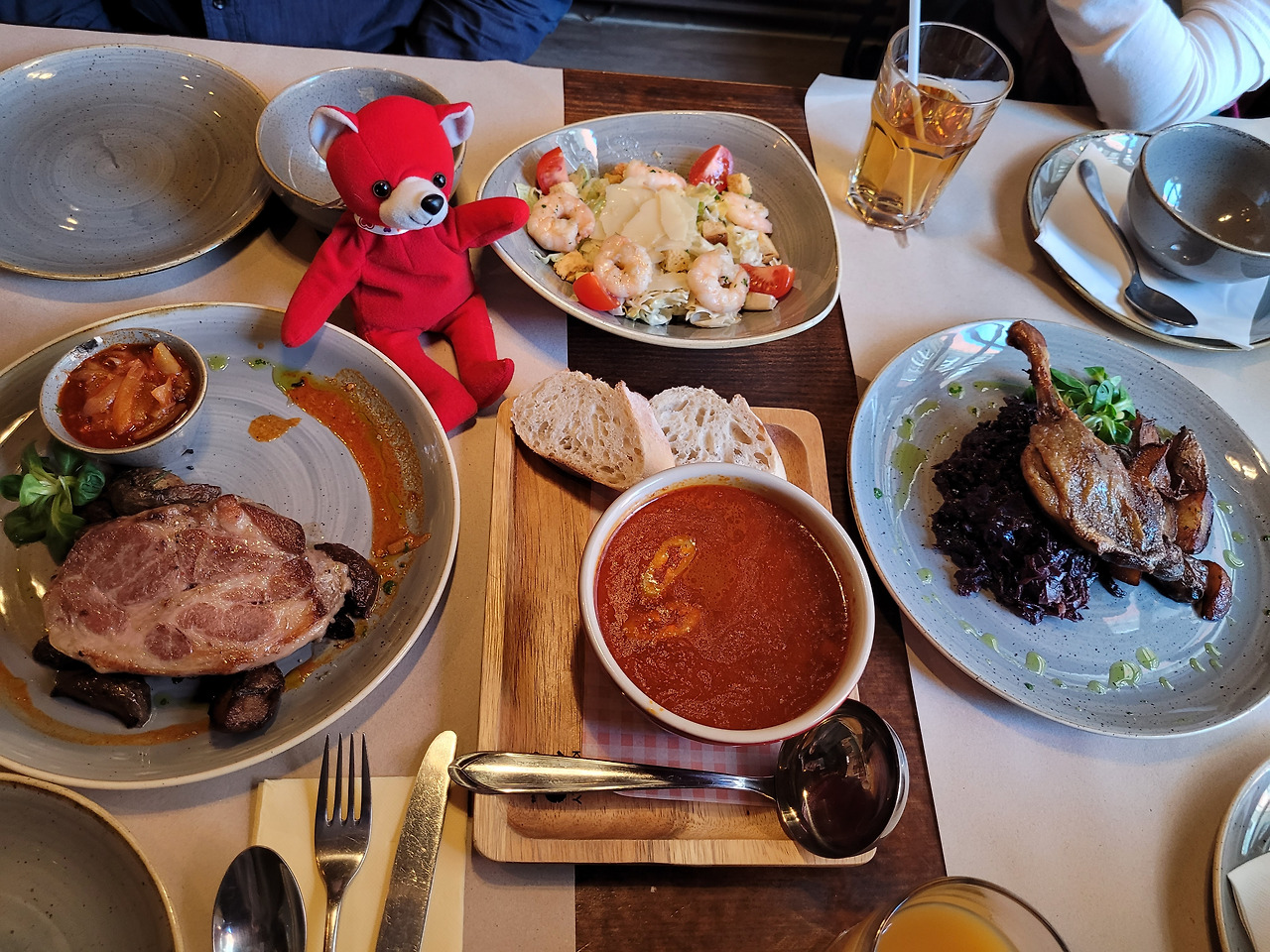 점심으로는 한국인 관광객이 가장 많이 간다는 키라이 100을 방문했다. 어느 블로그에서는 예약하고 방문하라고 했지만, 우리는 예약 없이 방문했다. 자리가 텅텅 비어 있어서 앉고 싶은 자리에 앉을 수 있었다. 직원들이 한국인인 것을 알아보고 한국어로 주문을 받고 한국인이 어떤 메뉴를 시킬지도 알고 있었다. 역시 한국인들. 헝가리 하면 굴라쉬가 가장 유명한 음식이라 굴라쉬랑 돼지고기 스테이크, 새우시저샐러드, 오리다리구이를 시켰다. 그리고 헝가리 생맥주도 주문했다.