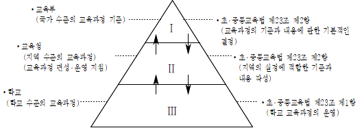 또한, 교육과정은 법령에 근거하여 마련되고 실천된다는 점에서 법제적 의미를 지닌다. 우리나라의 경우 초․중등학교 교육은 ‘교육기본법’과 ‘초․중등교육법’에 따라 운영하도록 규정되어 있다. 교육기본법 제2조에는 우리나라의 교육 이념이 제시되어 있다. 초․중등교육법 제23조 제2항에는 초․중등학교 교육과정의 기준과 내용에 관한 기본적인 사항을 교육부 장관이 정하도록 규정하고, 시․도 교육감은 이에 근거하여 지역의 실정에 적합한 기준과 내용을 정할 수 있도록 하고 있다. 또한 학교는 초․중등교육법 제23조 제1항에 의거 학교 교육과정을 운영하여야 한다. 이와 같은 관련 법령에 근거하여 국가에서는 초․중등학교 교육과정을 고시(공포)하여 시행하고 있다. 이렇게 문서화된 국가 수준 교육과정은 ‘제7차 교육과정’ 혹은 ‘2007 개정 교육과정’이라는 명칭을 부여해 왔으며, 2015 개정 교육과정은 2015년 9월 23일에 개정 고시되었다.