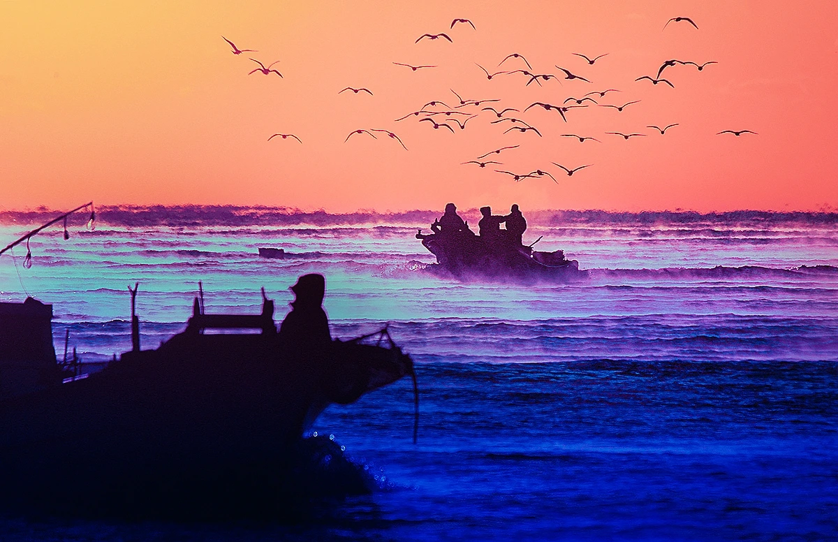힘들게 조업을 마치고 돌아오는 길, 갈매기들에게 선뜻 물고기를 나눠주는 마음이었다.
