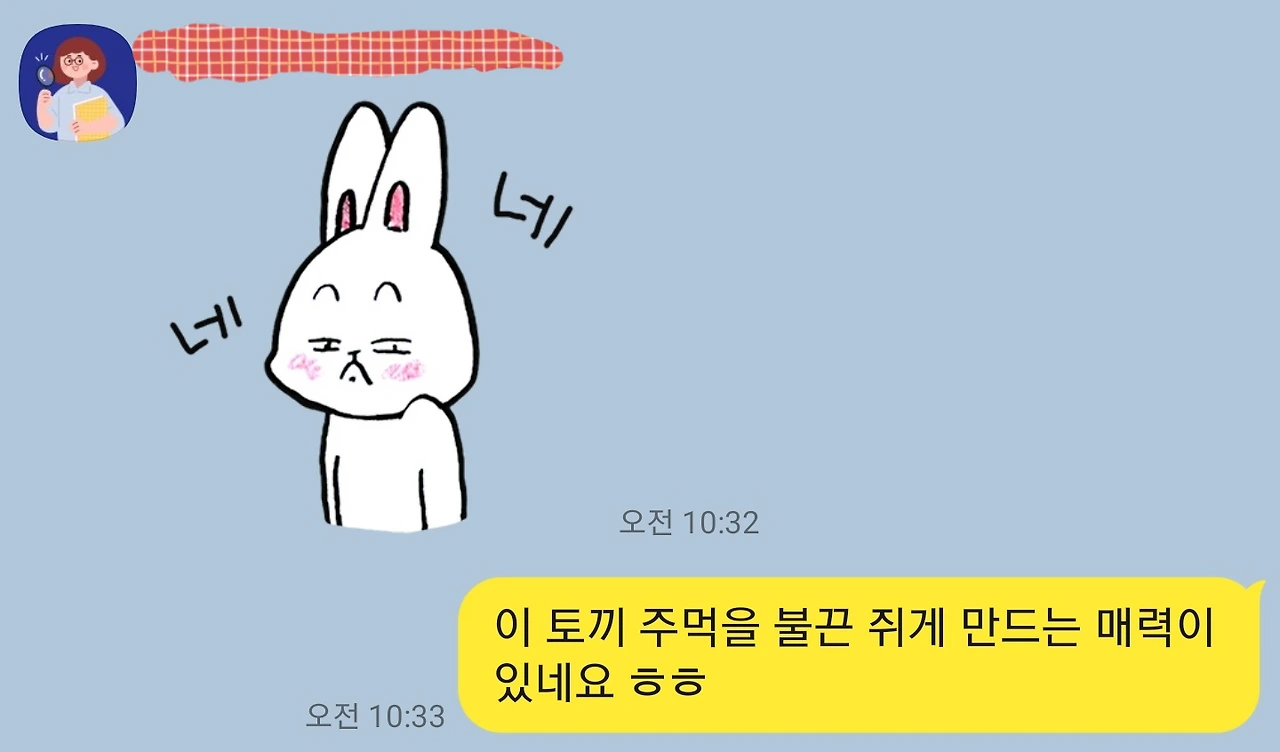 '어절씨구리, 이 인간이 지금 나랑 한번 해보자는 건가?' 하는 생각이 든 나는 곧바로 "이 토끼, 주먹을 불끈 쥐게 만드는 매력이 있네요 ㅎㅎ" 하고 메시지를 날렸다. '만일 옆에 앉아있었더라면 널 한 대 쥐어박고 싶다'는 의미였다.