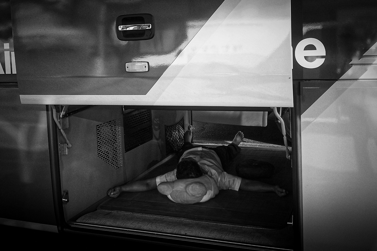 기름값을 아끼기 위해 시동을 끈채 버스 화물칸을 침대 삼아 단잠을 주무시는 아버지