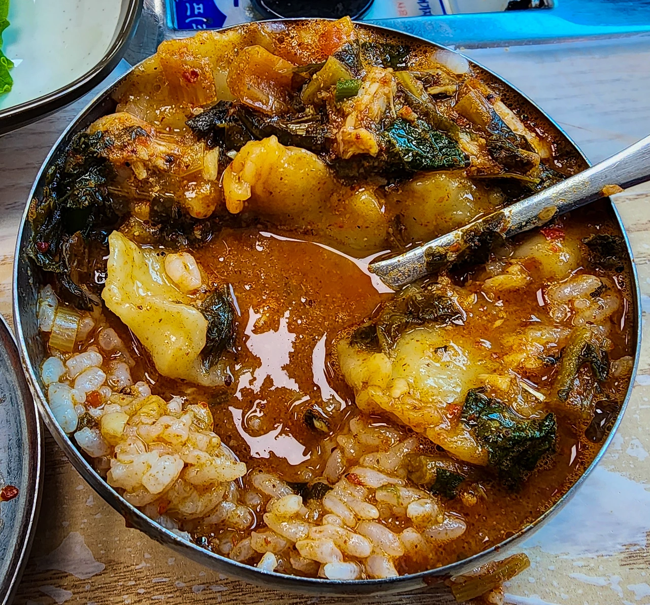 문제는 이 수제비 어탕이란 녀석이 아주 매우 많이 <존맛>이라는 거다. 그 맛에 취해 열심히 먹다 보면 밥이 국물을 부르고, 국물이 다시 밥을 부르는 악순환이 반복된다. 그 국물에 수제비를 비롯한 각종 건더기들이 함께 딸려오게 마련이고, 그것들을 열심히 먹다 보면 어느덧 평소 식사량의 1.5배 내지 2배 정도를 먹어버리게 된다.