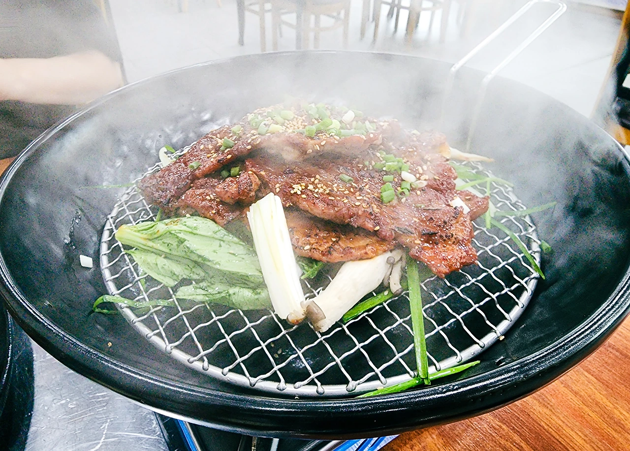 고기를 먹을 때 야채를 곁들여 먹는 걸 좋아하는 우리 식구 식성과도 잘 맞을 거 같았다. 구운 고기 하면 보통 불판에다가 고기만 열심히 구워 내놓는 경우가 대부분인데, 이 집 고추장불고기는 야채를 바닥에 깐 뒤 그 위에 고기를 올려 굽는 방식이었기 때문이다. 고기 먹을 때 야채 곁들이는 걸 별로 안 좋아하는 사람들은 별로라 생각할지 몰라도, 내 입장에선 보는 순간 "딱 우리 스타일이얏!" 하는 탄성이 절로 터져나왔다.