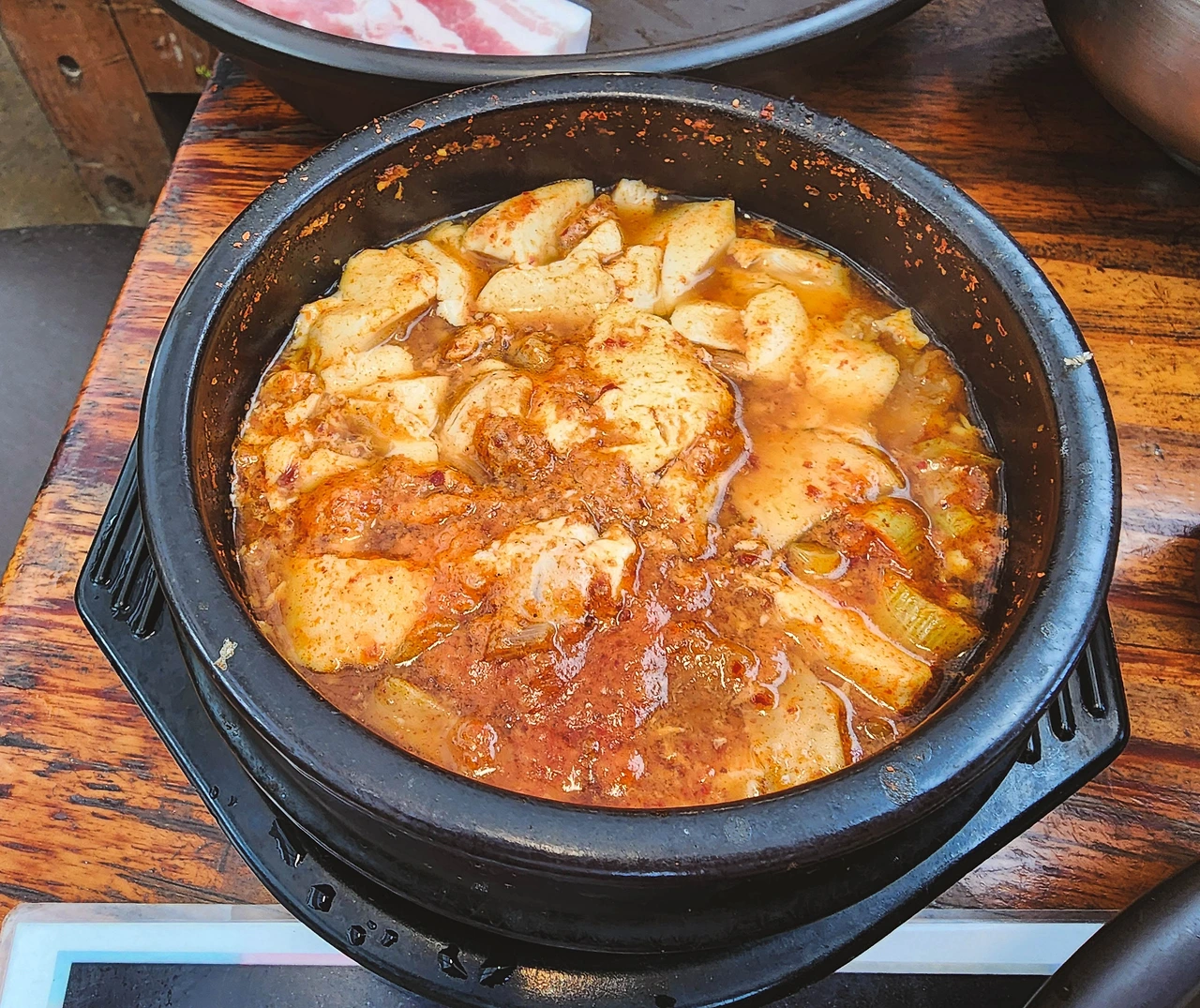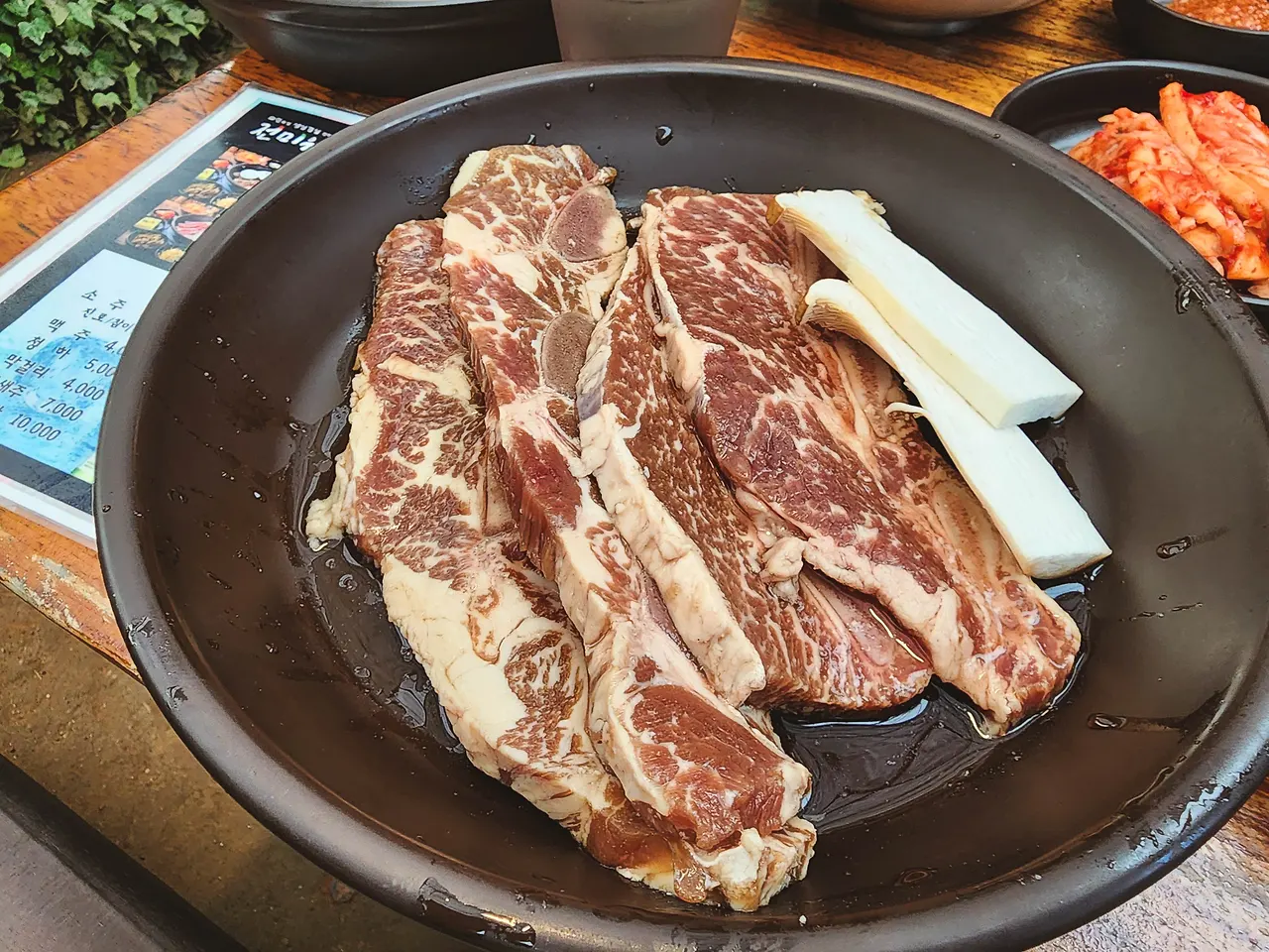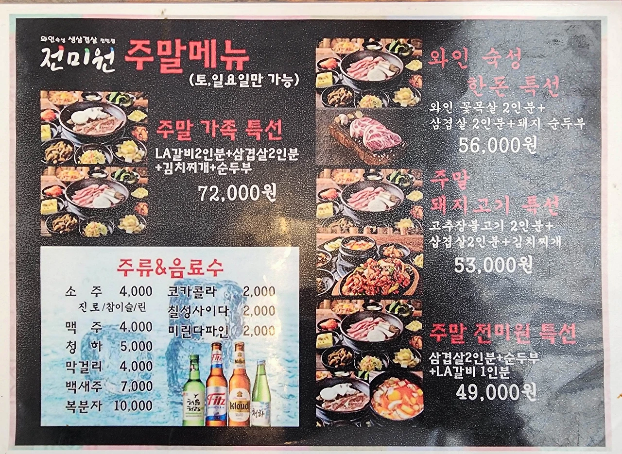 대전현충원에 계신 아버지 성묘를 갔다가 인근 맛집을 검색한 끝에 가족들과 함께 처음 찾아가 봤는데, 분위기도 분위기지만 이색'맛집'답게 음식맛도 일품이었다. 우리 가족은 이집 시그니처 메뉴인 7만2천원짜리 주말 가족특선을 주문했는데, 와인삼겹살 2인분과 양념 LA갈비 2인분, 묵은지 김치찌개, 북창동 순두부찌개로 이루어진 구성이 아주 좋았다.