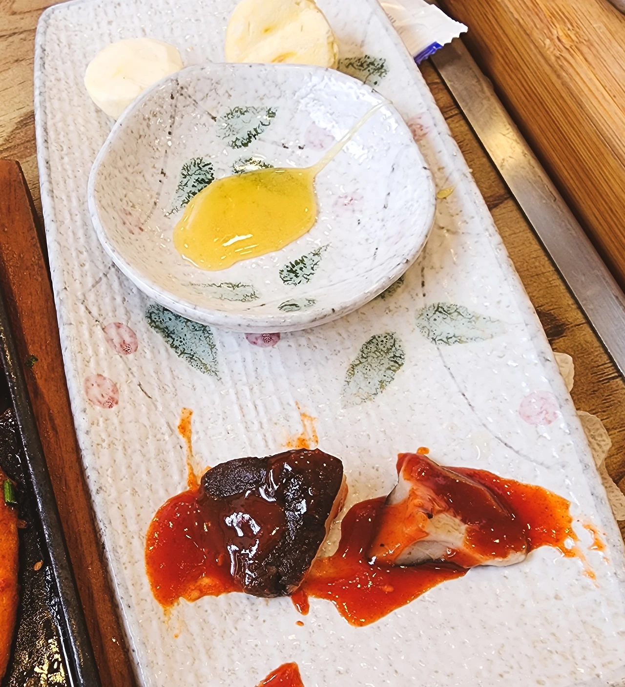 그 중에서도 어지간한 식당에선 흐물흐물하고 맛도 없어 젓가락이 저절로 피해가게 만드는 묵 무침의 경우 사이드가 아닌 정식 메뉴로 시켜먹고 싶을 만큼 그 맛이 제대로였고, 공주 특산품인 알밤을 활용해 꿀을 찍어먹으라고 내온 맛보기 음식은 다른 곳에선 맛보기 힘든 별미였다.