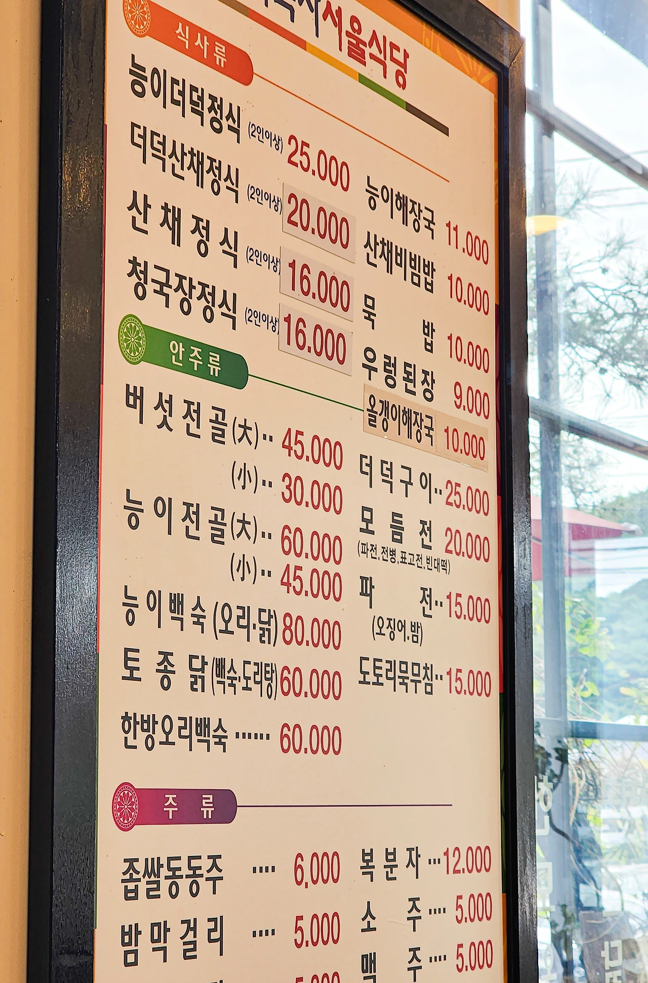 우리가 선택한 메뉴는 이 집 시그니처 메뉴인 더덕산채정식. 1인분에 2만원이었는데, 짜장면 혹은 냉면 한 그릇에 만원을 넘나드는 고물가 시대인만큼 큰 기대는 하지 않았다. 주메뉴가 산삼 버금가는 약효를 가진 고급음식 더덕이라는 사실까지 감안하면 2만원이라고 해봐야 사실 그닥 기대할 만한게 없다는 판단이 들어 얼마간 포기하는 마음도 있었을 거다.