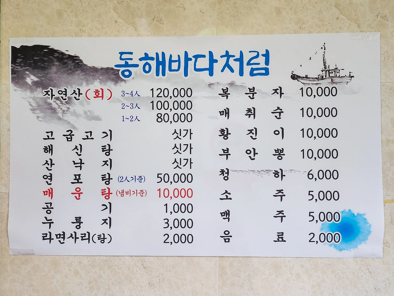 낚시로 잡아오건 어쨌건 자연산 회를 가성비 좋게 제공해 준다는 게 가장 중요한 뽀인트인데, 이에 더해 내가 <동해바다처럼>을 아주 매우 많이 좋아하는 이유는 사장님의 푸짐한 인심 때문이다. 2인상에 뭐뭐가 나가고 4인상엔 뭐시기뭐시기가 추가되는 그런 정형화된 서비스가 아니라, 그날그날 준비되는 재료에 맞춰 깜냥껏 서비스를 내주는 인심이 마치 그 옛날 주머니 가벼웠던 우리 아버지들 단골가게처럼 푸근한 느낌을 준다.